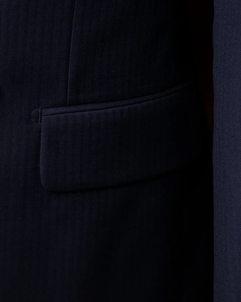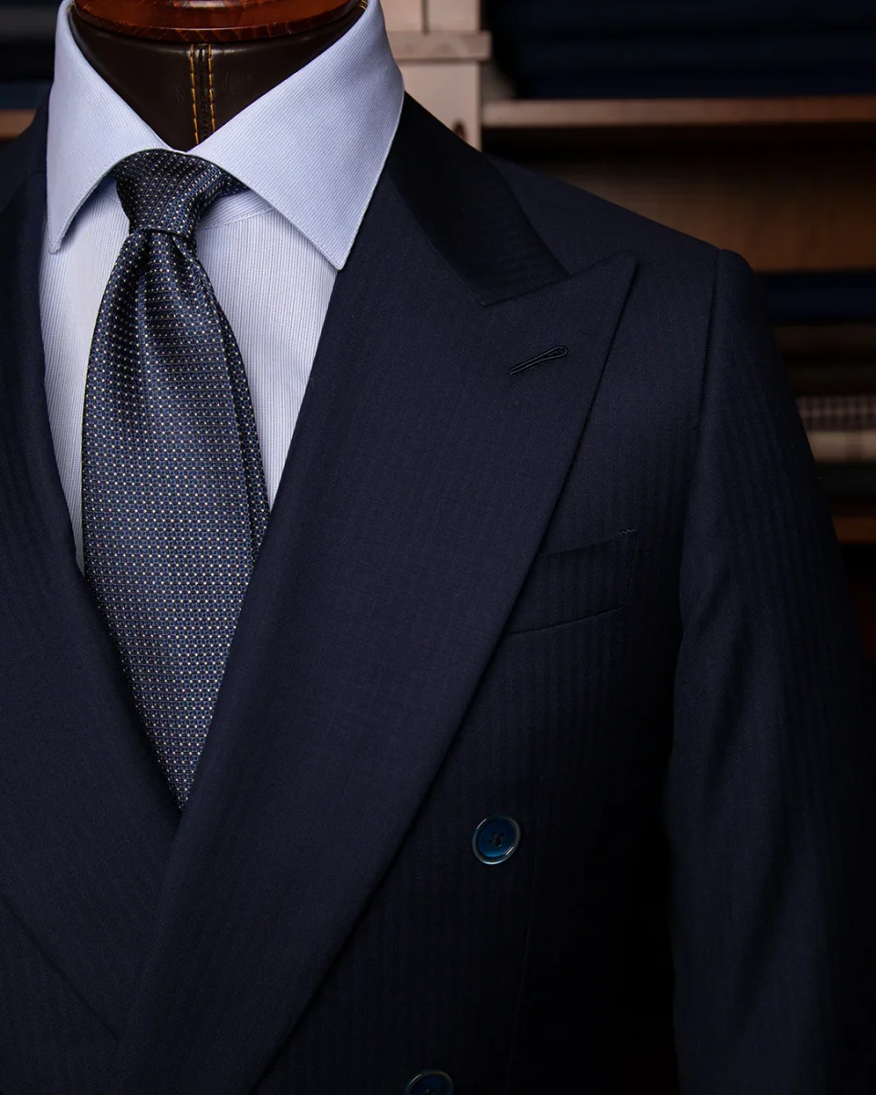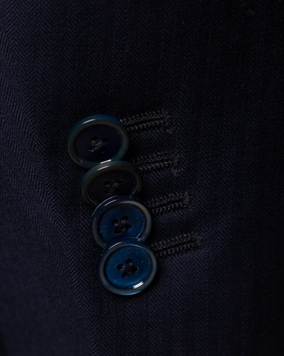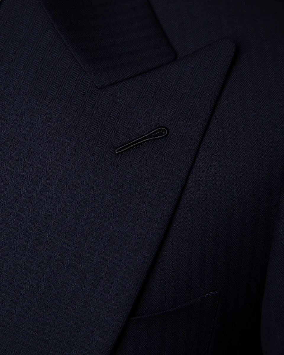 - Materiale: Selezione superiore di lana Blu Scuro Spinato dall’appiombo monumentale.