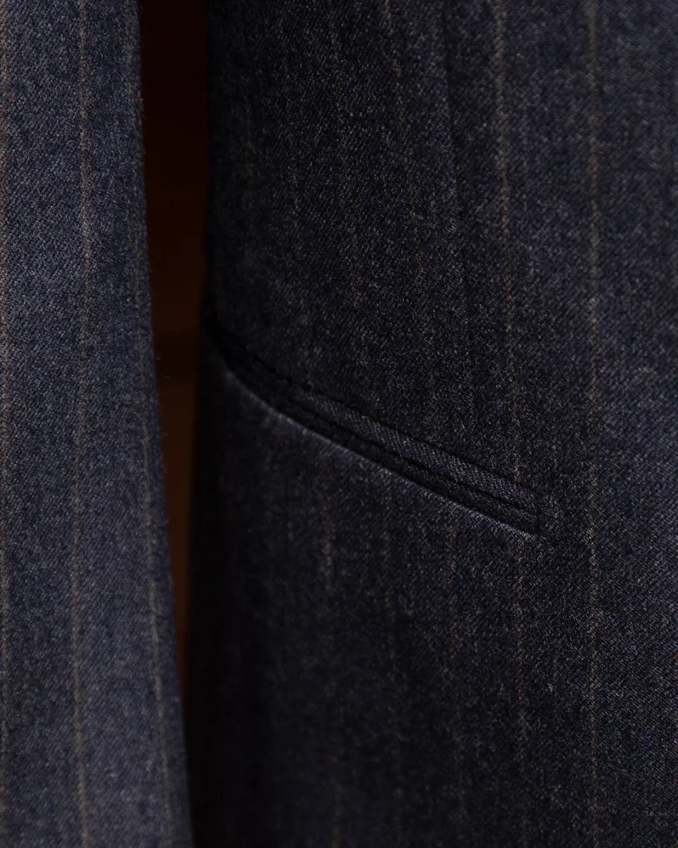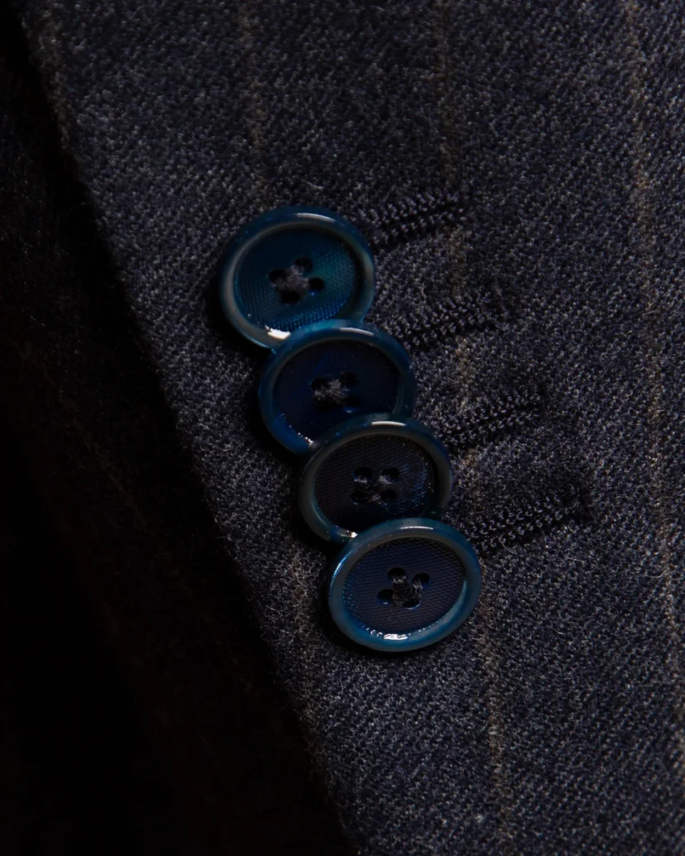 - Chiusura giacca: sei bottoni, disposti per un effetto doppiopetto che aggiunge slancio e autorevolezza alla silhouette.