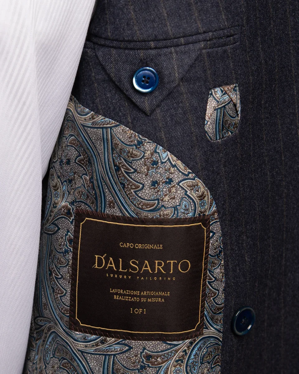 Un abito che interpreta l’eleganza del gessato con una nota di colore innovativa, pensato per chi vuole trasmettere autorevolezza e originalità nel mondo del lavoro.