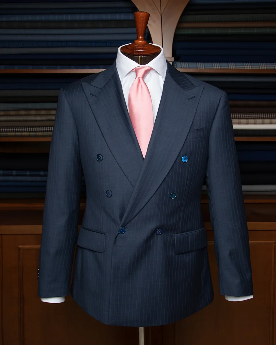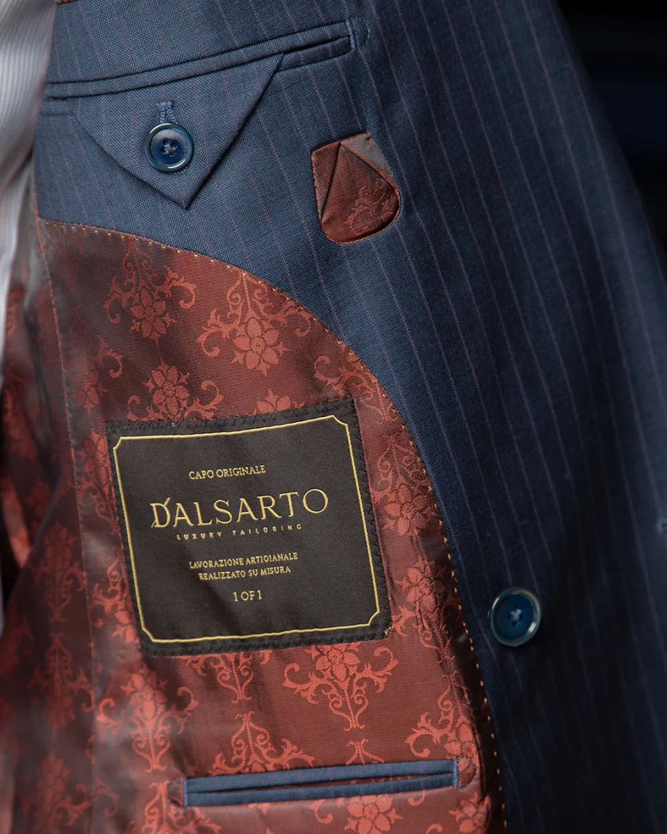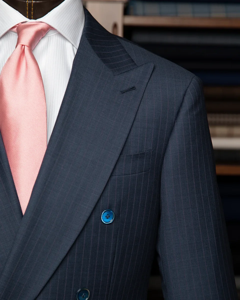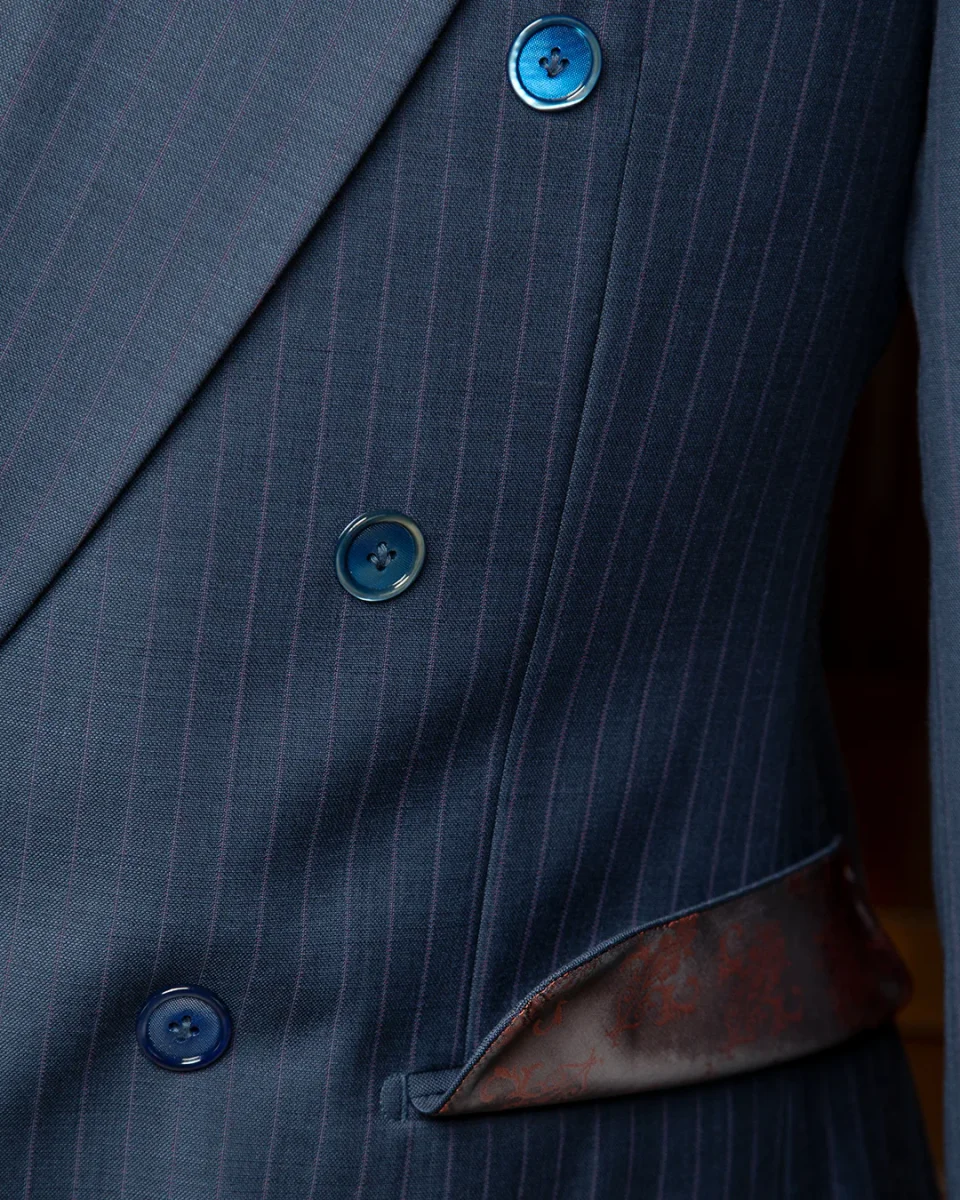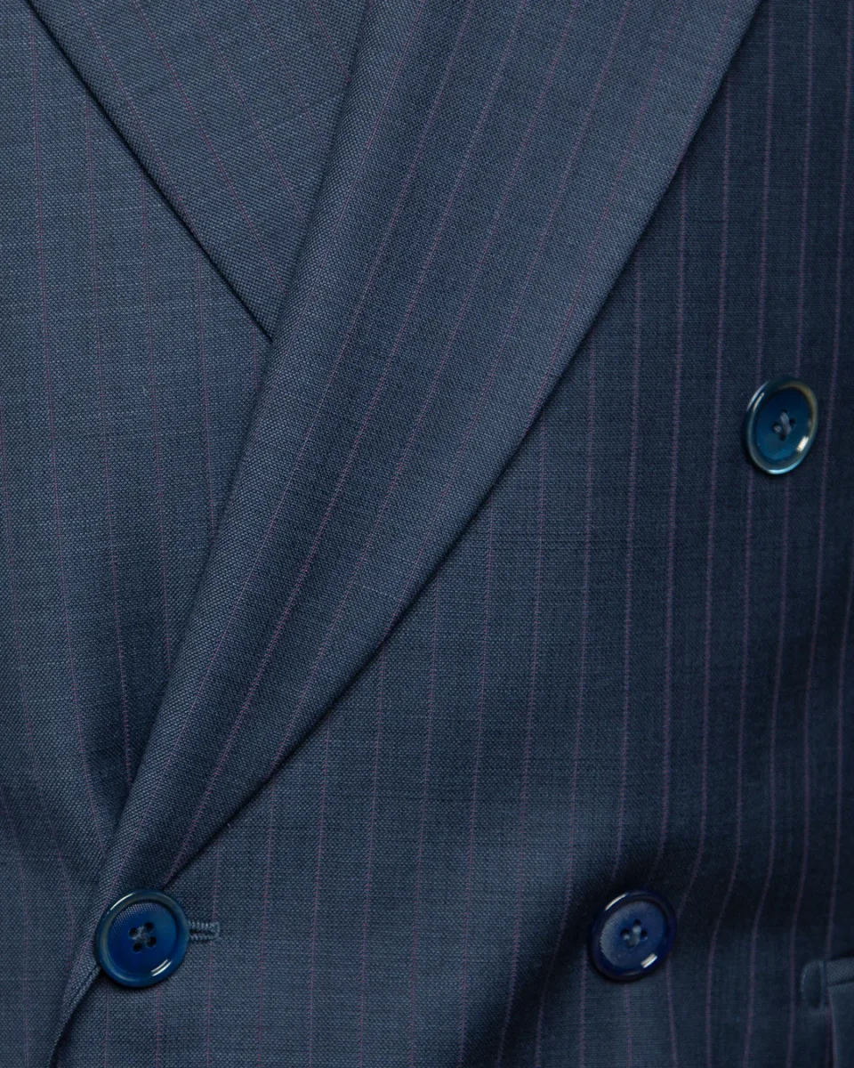 L’Abito Perugino eleva il concetto di gessato attraverso l’uso di una pregiata lana Super 120s in tonalità Blu Pavone, attraversata da una sottile e sofisticata riga Glicine. La costruzione doppiopetto 6×1 crea una linea a “V” profonda e scultorea, culminando in imponenti rever a lancia che conferiscono un’autorità indiscussa alla silhouette.