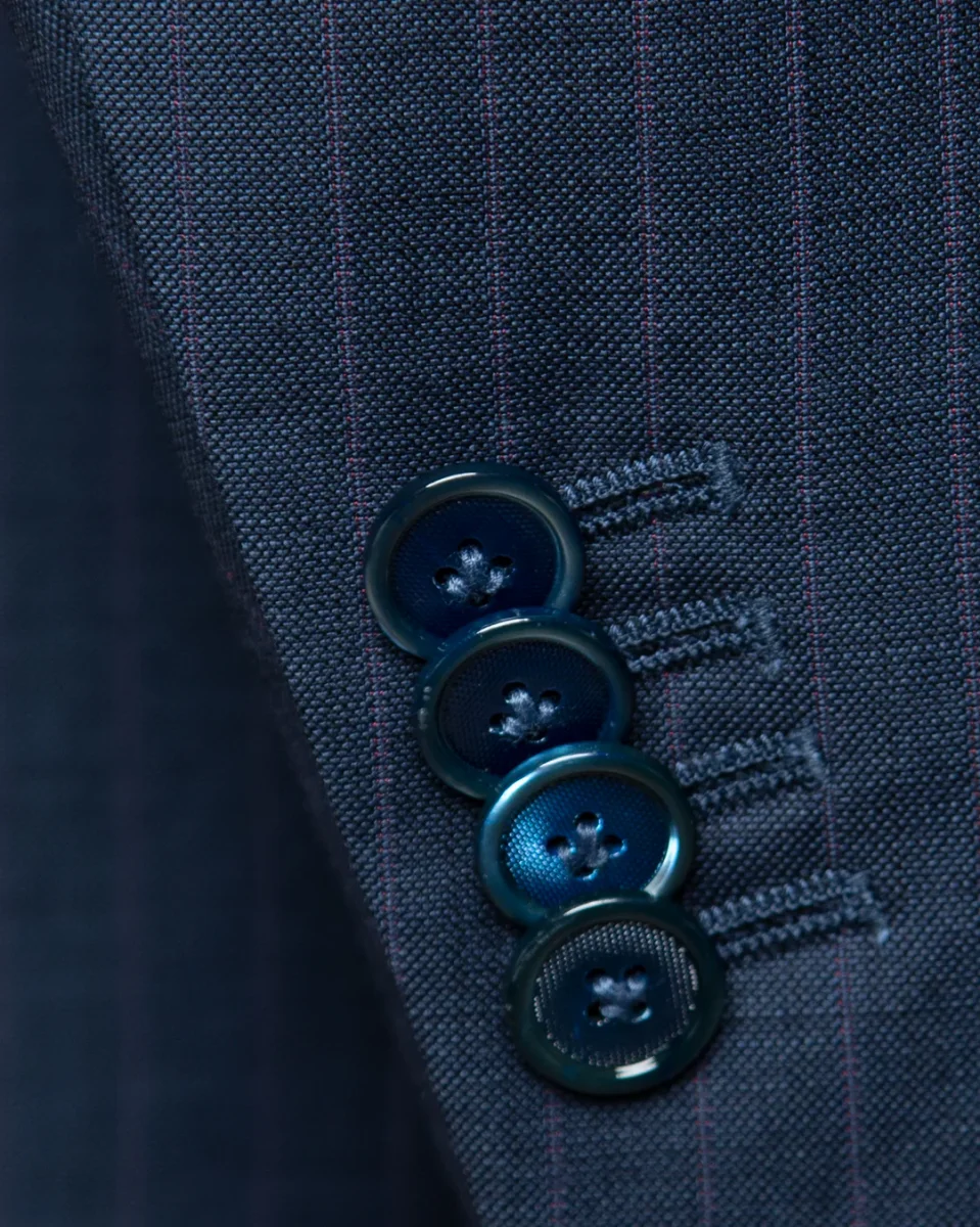 - Dettagli Sovrani: Bottoni in autentica madreperla blu e tasche con pattina.
