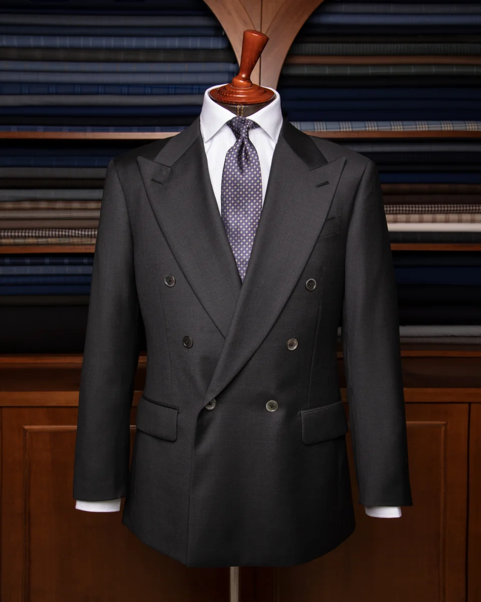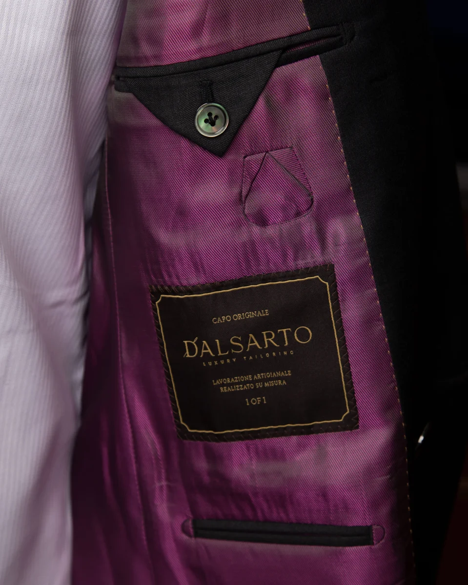 L’Abito Perugino in questa tonalità Grigio Antracite rappresenta l’apice della sartoria formale contemporanea. Il tessuto si distingue per una lucentezza naturale e una grana finissima che cattura la luce, donando al capo un aspetto dinamico e mai piatto. La configurazione doppiopetto 6×1 è progettata per offrire un’immagine di grande impatto: l’abbottonatura ribassata crea una “V” profonda sul torace che, unita all’ampio rever a lancia, allarga otticamente le spalle e slancia la figura.