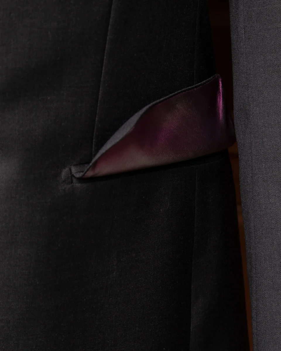 I dettagli sono curati per creare un dialogo di grigi: i bottoni in madreperla grigi riflettono le sfumature del tessuto, mentre le tasche con pattina aggiungono un tocco di struttura classica. Il vero segreto di stile è custodito all’interno: una fodera viola cangiante intenso, che offre un contrasto cromatico regale e sofisticato, visibile solo nei gesti più spontanei.