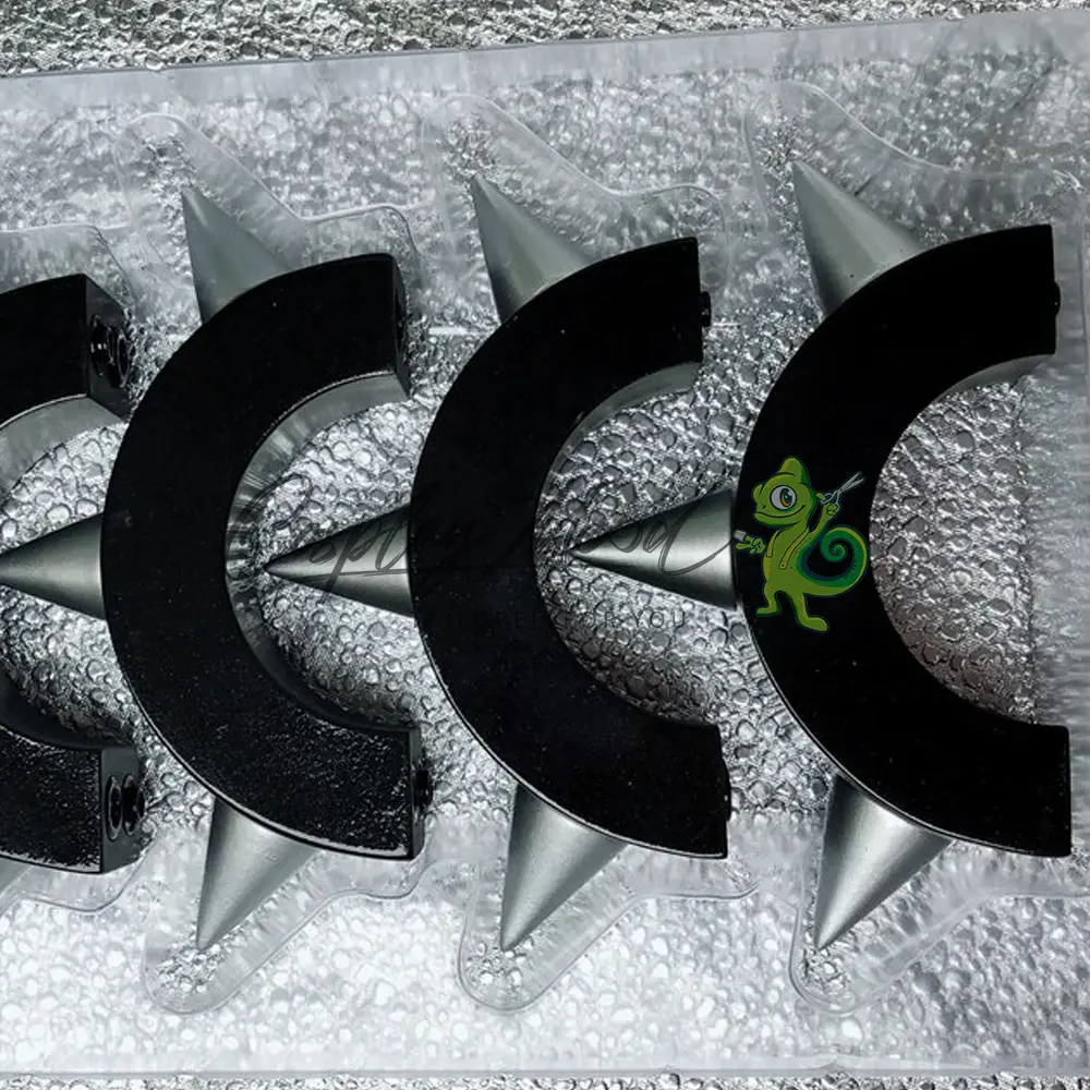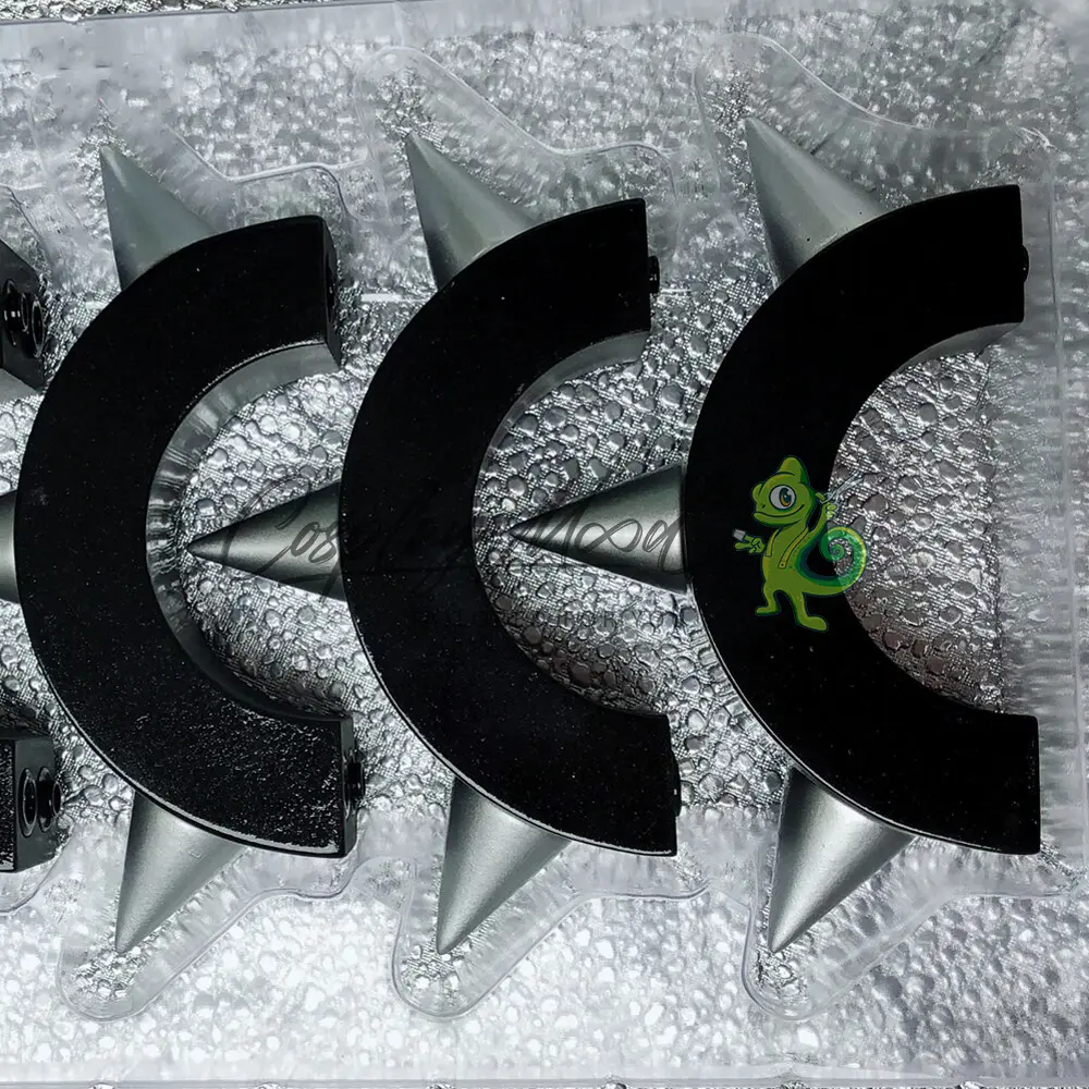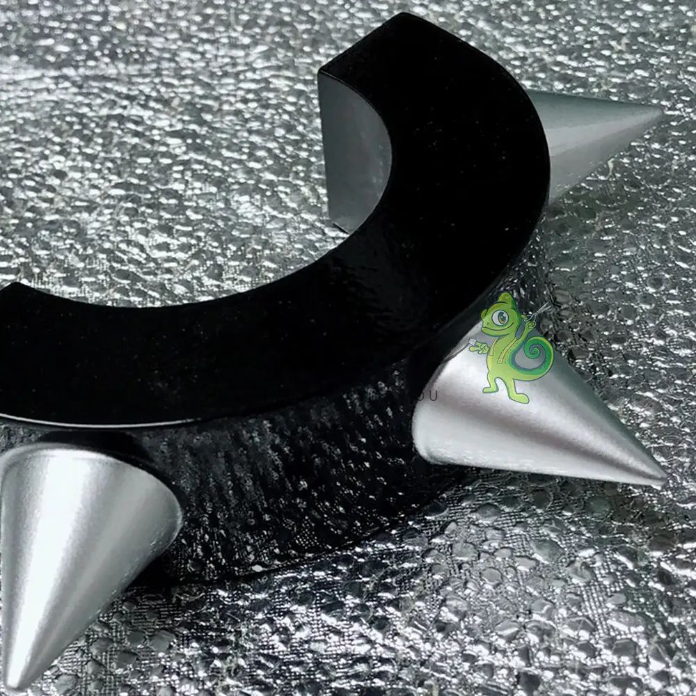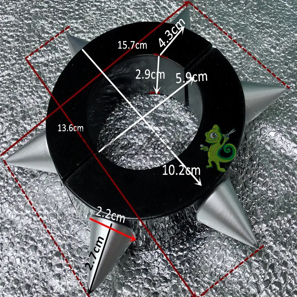I bracciali sono realizzati in resina. Risultano perciò molto leggeri e maneggevoli. Come mostrato in foto sono apribili e richiudibili in maniera semplice. Ogni punta ha all’incirca una misura di 2,7 cm e l’altezza interna del bracciale è di circa 3 cm. La circonferenza interna al bracciale è approssimativamente 6 cm, mentre quella esterna misura 10,2 cm (senza contare le punte).