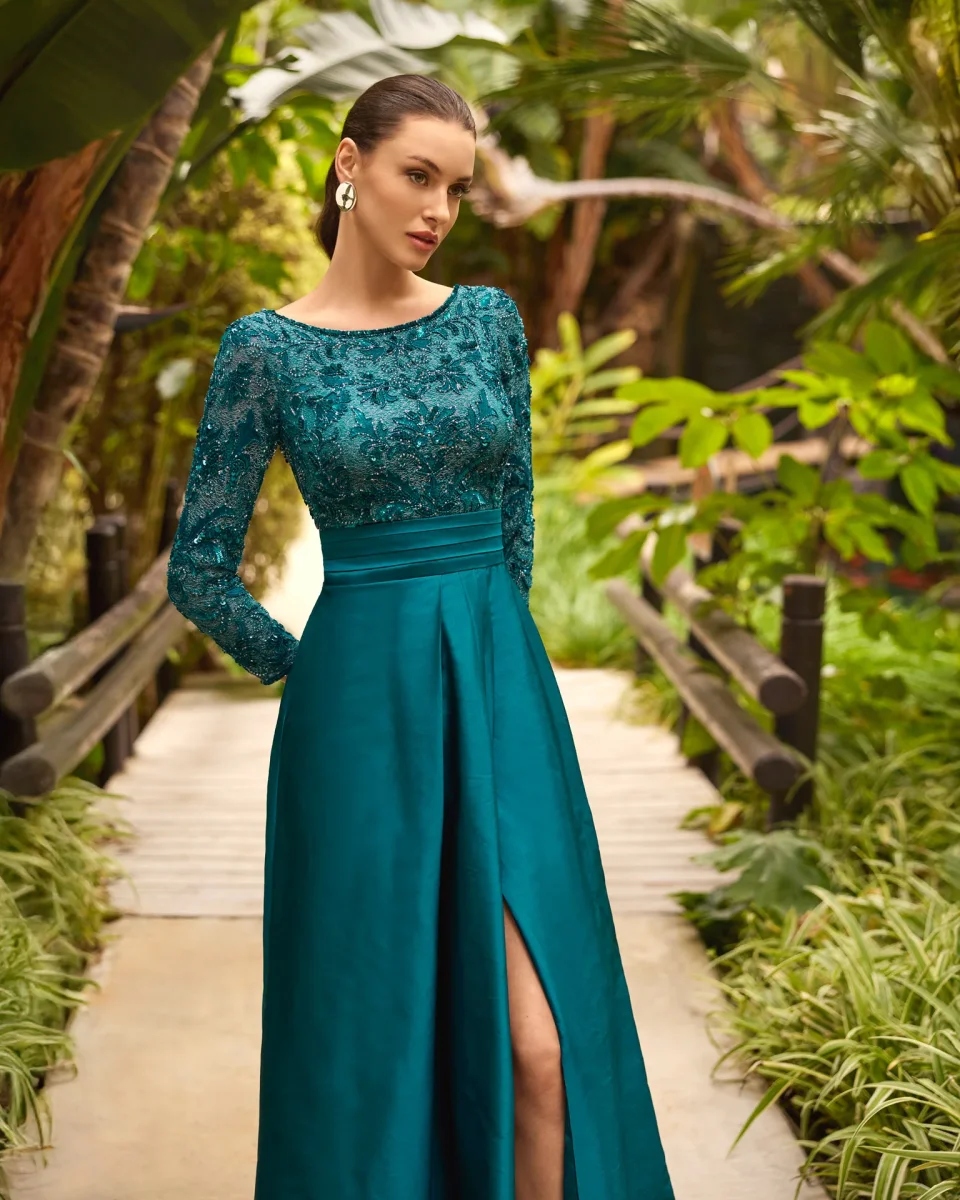 Le maniche lunghe in pizzo trasparente donano fascino e raffinatezza, rendendo il modello ideale per cerimonie formali, matrimoni ed eventi serali. La gonna lunga in mikado con spacco frontale aggiunge movimento e leggerezza, esaltando la silhouette senza rinunciare al comfort.