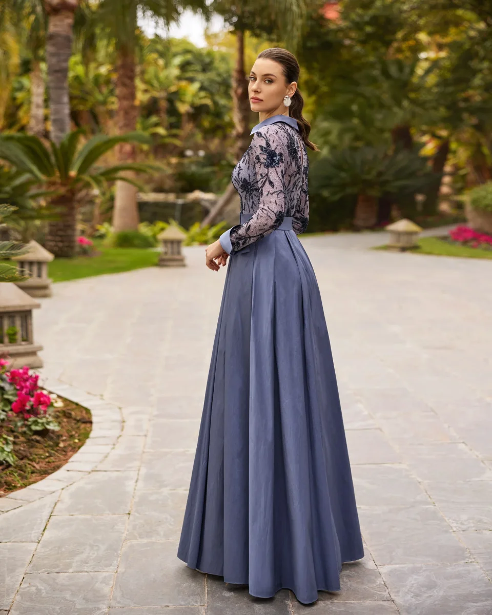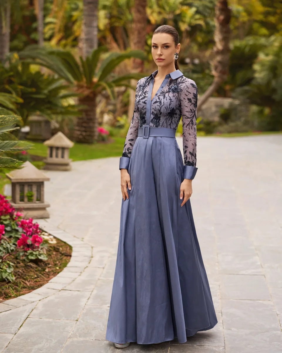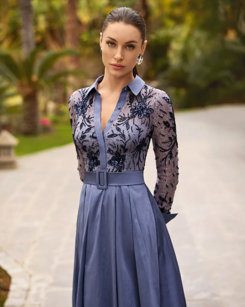 Il colletto e i polsini in tinta unita aggiungono un tocco sartoriale, mentre la gonna a ruota in mikado, ampia e strutturata, dona volume e movimento alla figura, valorizzando il punto vita grazie alla cintura coordinata. Il colore blu acciaio, intenso e moderno, è perfetto per cerimonie eleganti, eventi serali, gala o matrimoni formali.