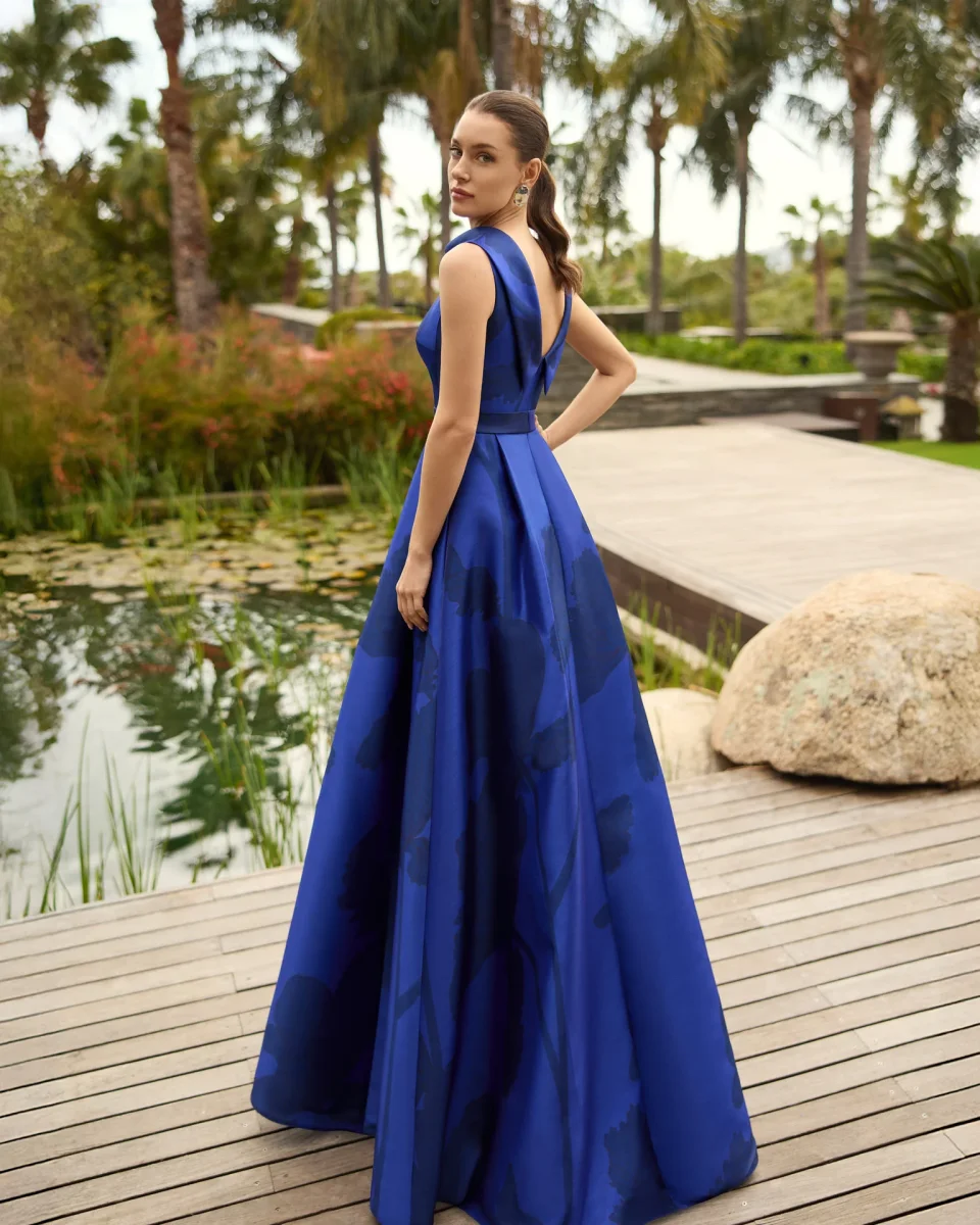Imponente, romantico e assolutamente regale: questo abito da cerimonia blu è la quintessenza dell’eleganza. Caratterizzato da un raffinato scollo sciallato che incornicia con dolcezza il décolleté, il modello si apre in una voluminosa gonna a campana, perfetta per chi desidera un look da grande occasione.