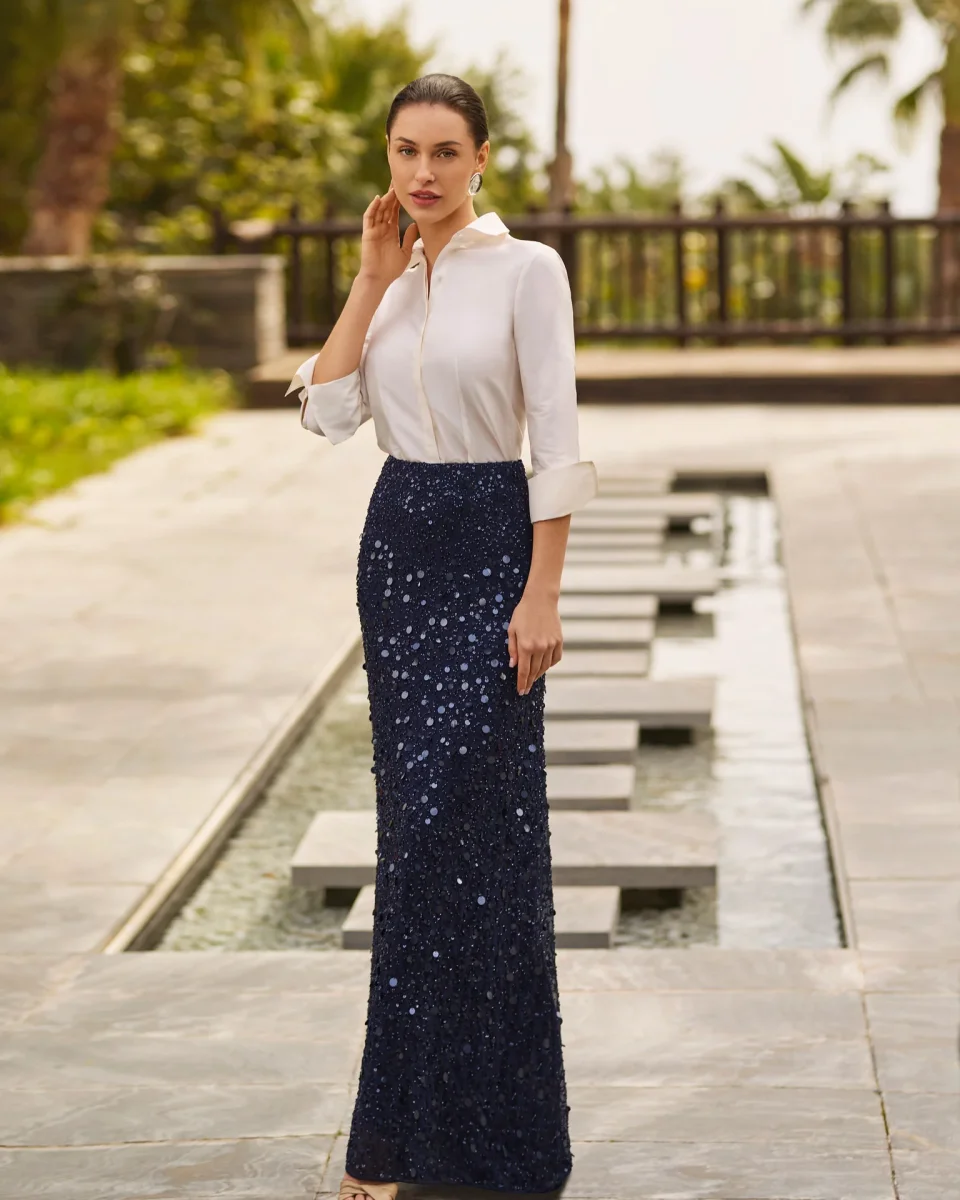 A completare il look, una gonna lunga in blu marino ricoperta da una preziosa lavorazione di paillettes tono su tono e micro perline, che creano un effetto luminoso e tridimensionale su tutta la silhouette. Il taglio dritto della gonna slancia la figura, mentre il contrasto cromatico con il bianco della camicia rende l’insieme armonioso e di forte impatto visivo.
