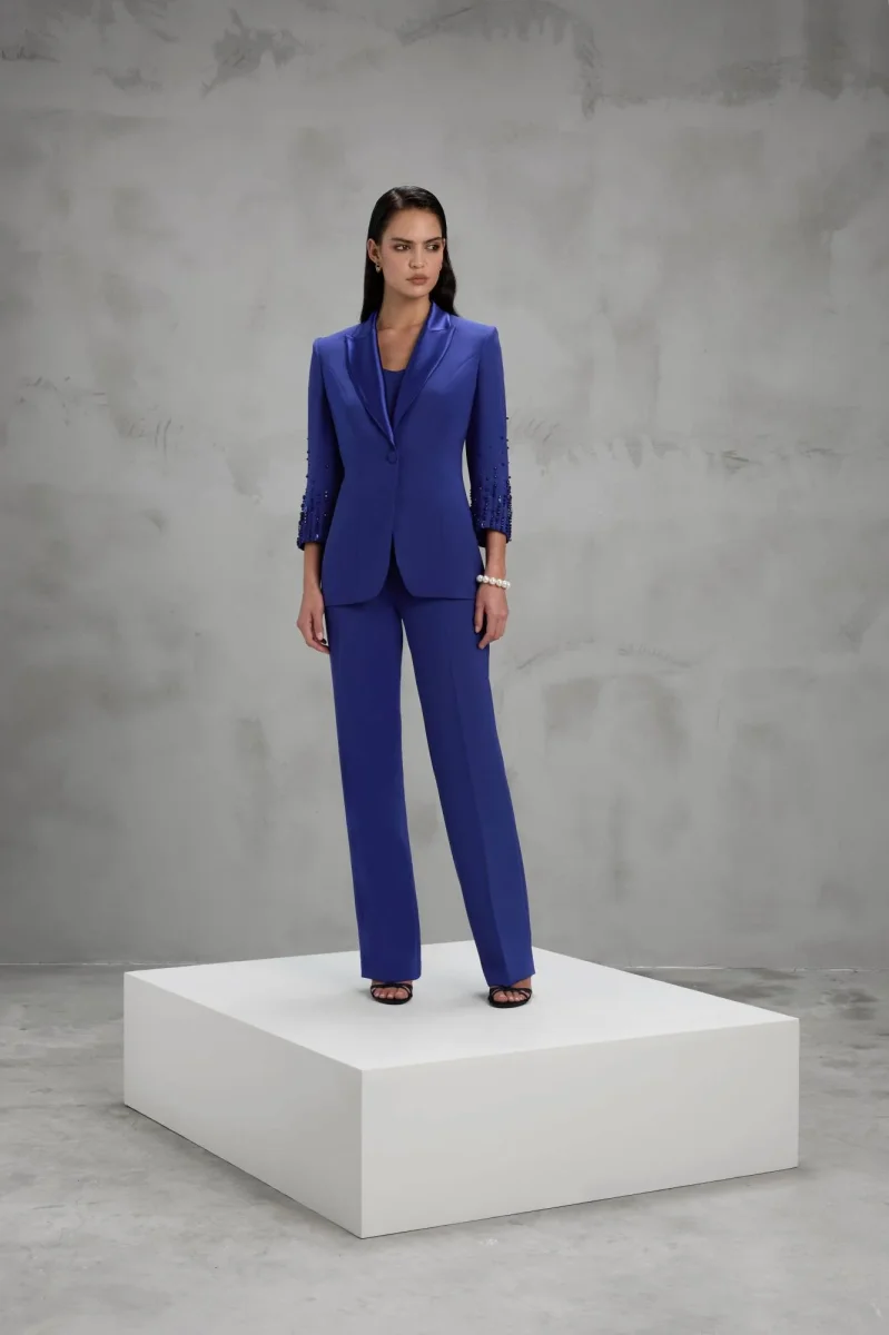 La giacca monopetto, dal design sartoriale e raffinato, presenta maniche a tre quarti impreziosite da ricami e perline ton sur ton che aggiungono luce e carattere al look. Il collo lancia, simbolo di classe e autorità, completa il capo con un tocco deciso e femminile, mentre il pantalone slancia la figura con una vestibilità elegante e confortevole.