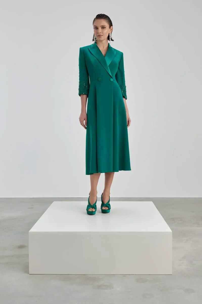 Deciso, raffinato e dal taglio sartoriale impeccabile: questo abito da cerimonia donna in verde smeraldo è la scelta perfetta per chi desidera un look di grande carattere e sofisticazione.