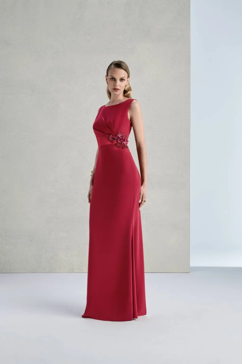 Sobrietà e raffinatezza si incontrano in questo abito da cerimonia lungo, perfetto per le donne che amano distinguersi con classe negli eventi più esclusivi. Il design minimal è valorizzato da uno scollo alto e leggermente asimmetrico, che dona un tocco contemporaneo e discreto al décolleté.