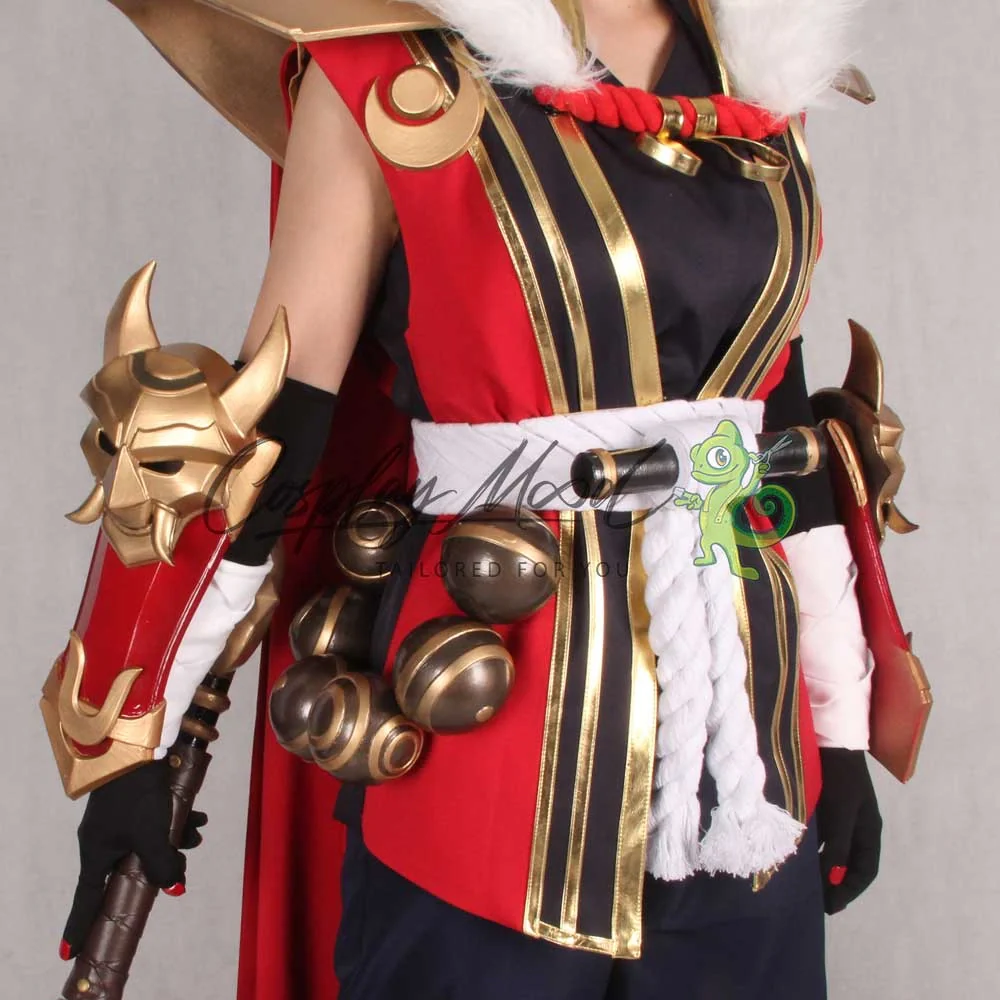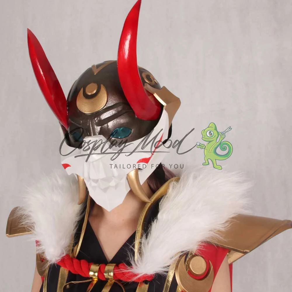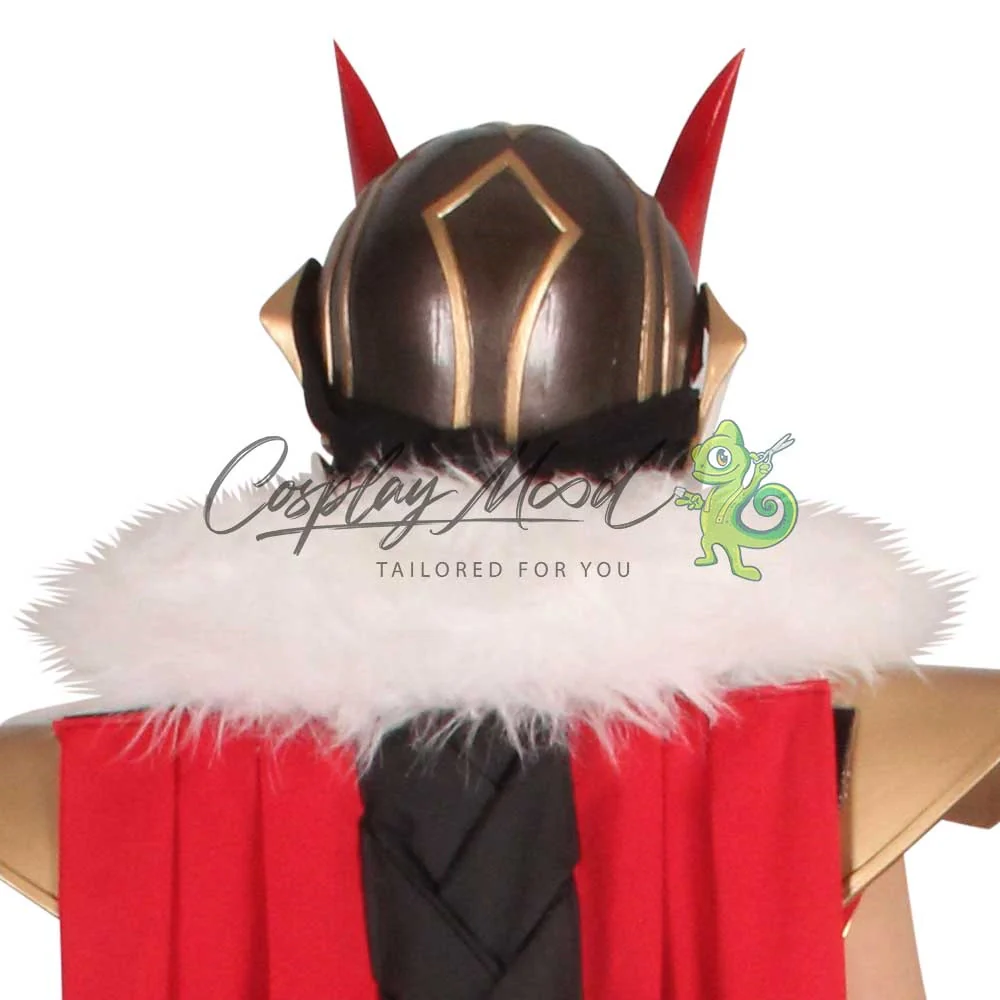 Una veste di colore rossa e nera con decorazioni dorate, con una fascia in vita di colore bianco e corredata di pantaloni con decori dorati, copripolpacci e sandali abbinati. Arricchisce questo outfit una serie di parti in armatura, come gli spallacci rigidi oltre alle due porzioni di armatura a protezione degli avambracci che richiamano il motivo della maschera. A corredo di tutto quanto c’è un mantello rosso e blu scuro con parti dorate in rilievo oltre all’immancabile e caratterista maschera con corna tipica del personaggio. Il tutto sarà realizzato in EVA foam e PVC oltre a tessuti selezionati e di qualità.