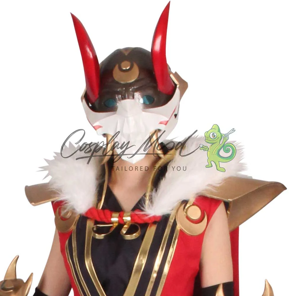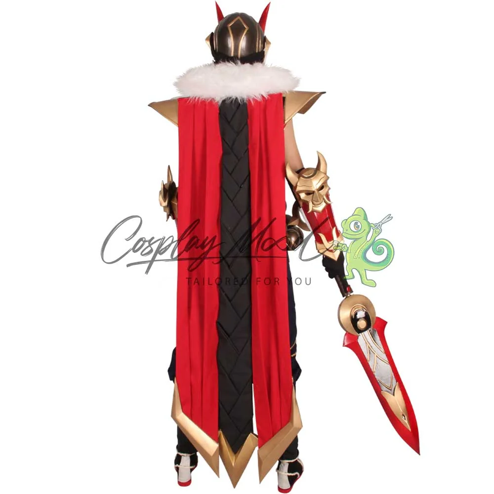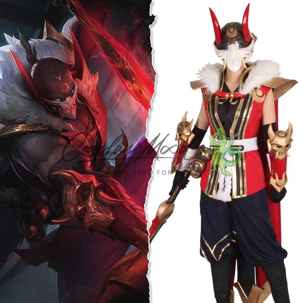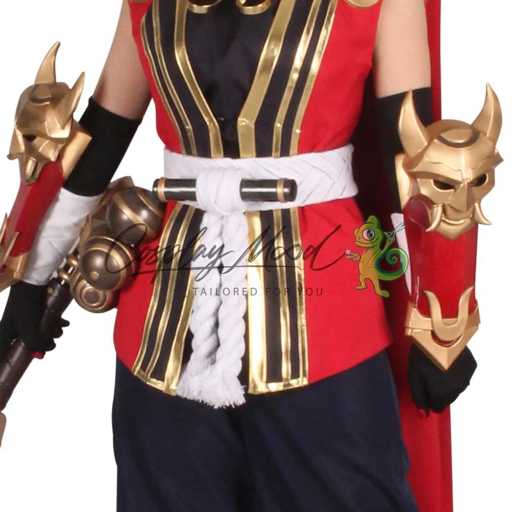 Una veste di colore rossa e nera con decorazioni dorate, con una fascia in vita di colore bianco e corredata di pantaloni con decori dorati, copripolpacci e sandali abbinati. Arricchisce questo outfit una serie di parti in armatura, come gli spallacci rigidi oltre alle due porzioni di armatura a protezione degli avambracci che richiamano il motivo della maschera. A corredo di tutto quanto c’è un mantello rosso e blu scuro con parti dorate in rilievo oltre all’immancabile e caratterista maschera con corna tipica del personaggio. Il tutto sarà realizzato in EVA foam e PVC oltre a tessuti selezionati e di qualità.