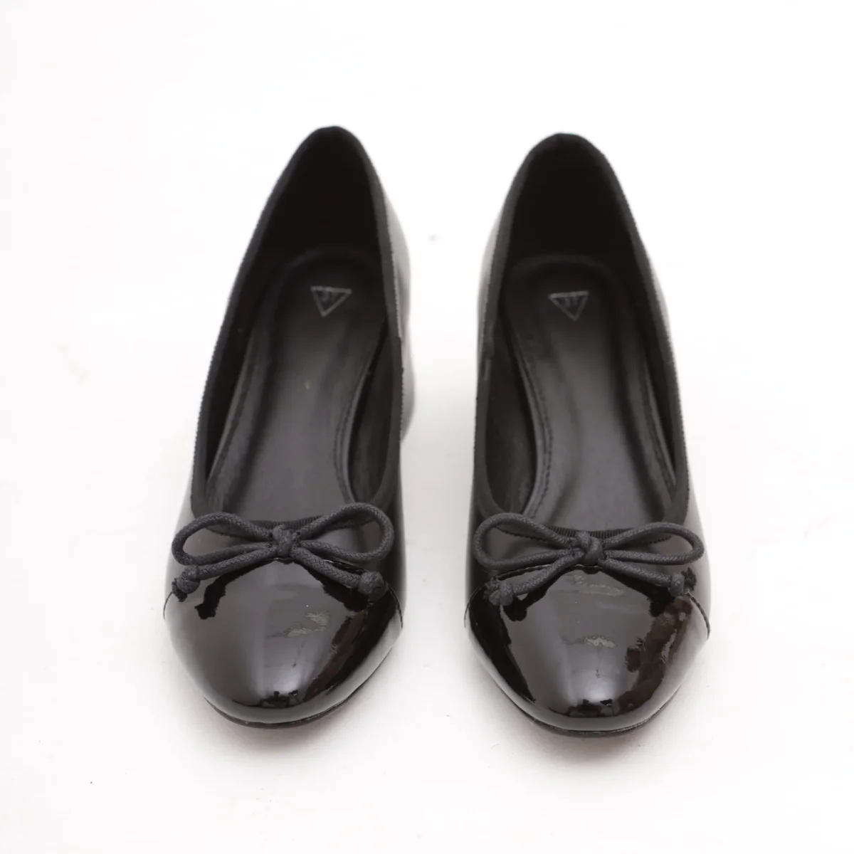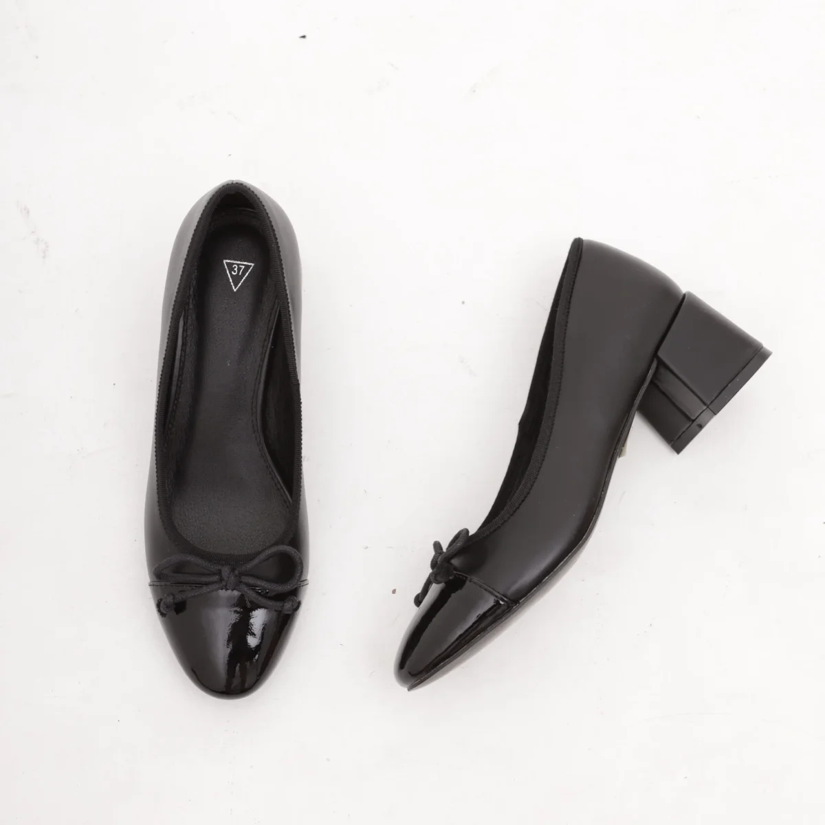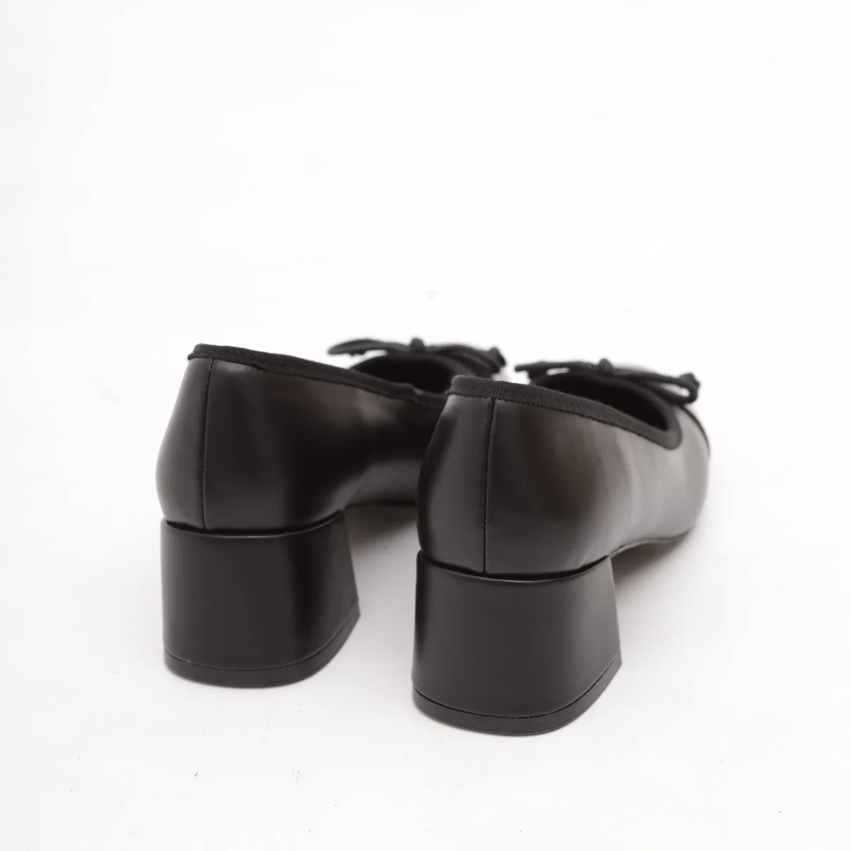 Scarpa con tacco bicolore realizzata in eco-pelle Nero. Decorato con fiocchietto. Disponibile in altri colori Panna e Cuoio.
