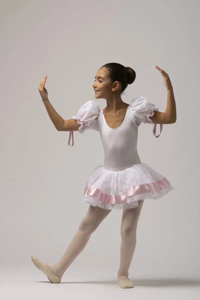 Body di Lycra con maniche a palloncino e gonnellina di tulle e merletto. Rifiniture di raso