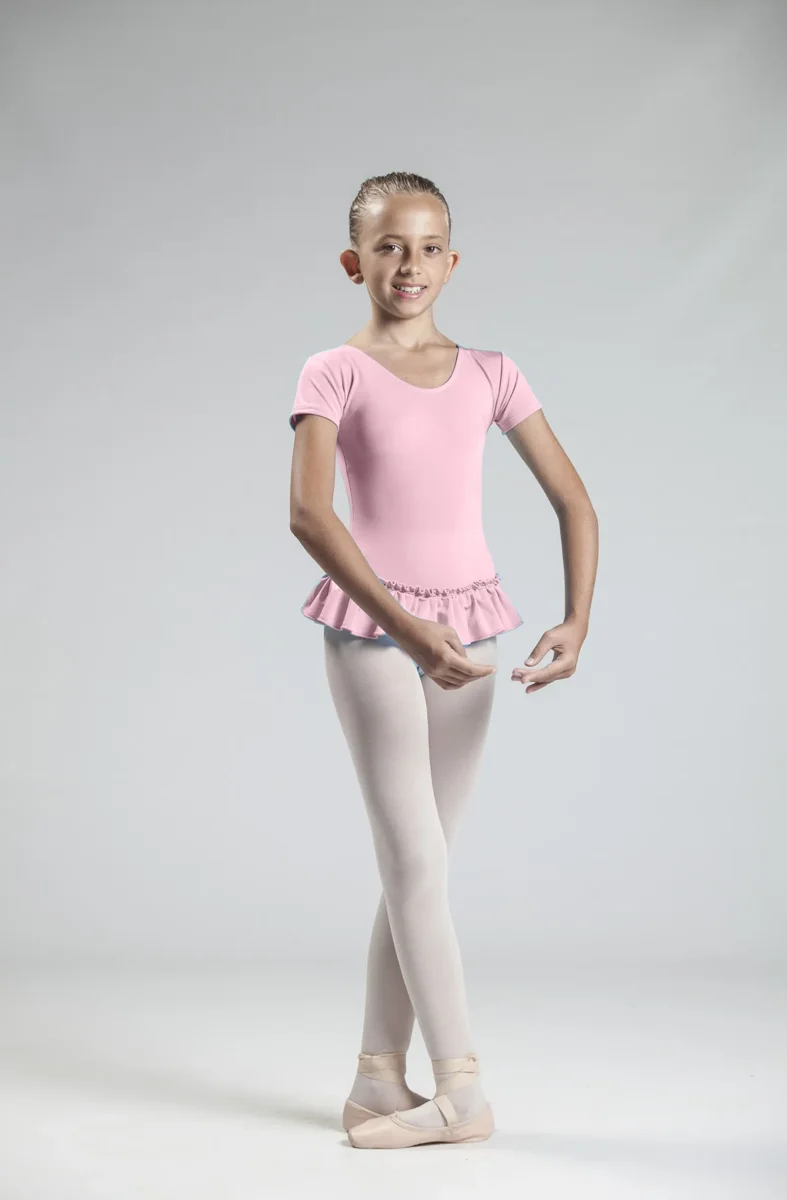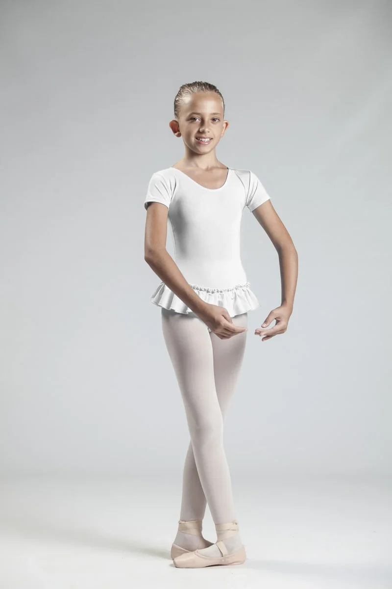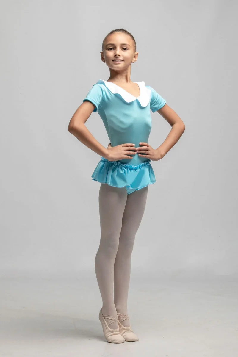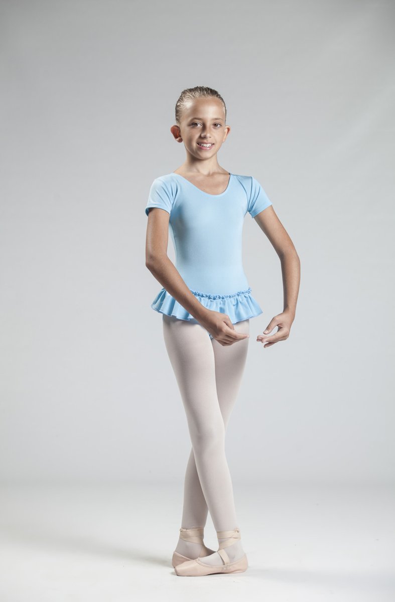 Body semplice reso più grazioso dalla presenza del gonnellino. Il gonnellino molto corto permette all’insegnante di osservare tutti i movimenti dell’allieva. E’ adatto alle ragazze di età più giovane.