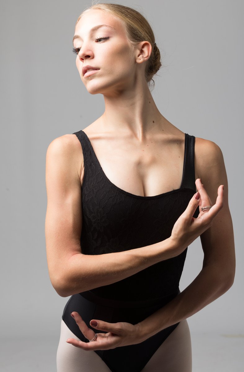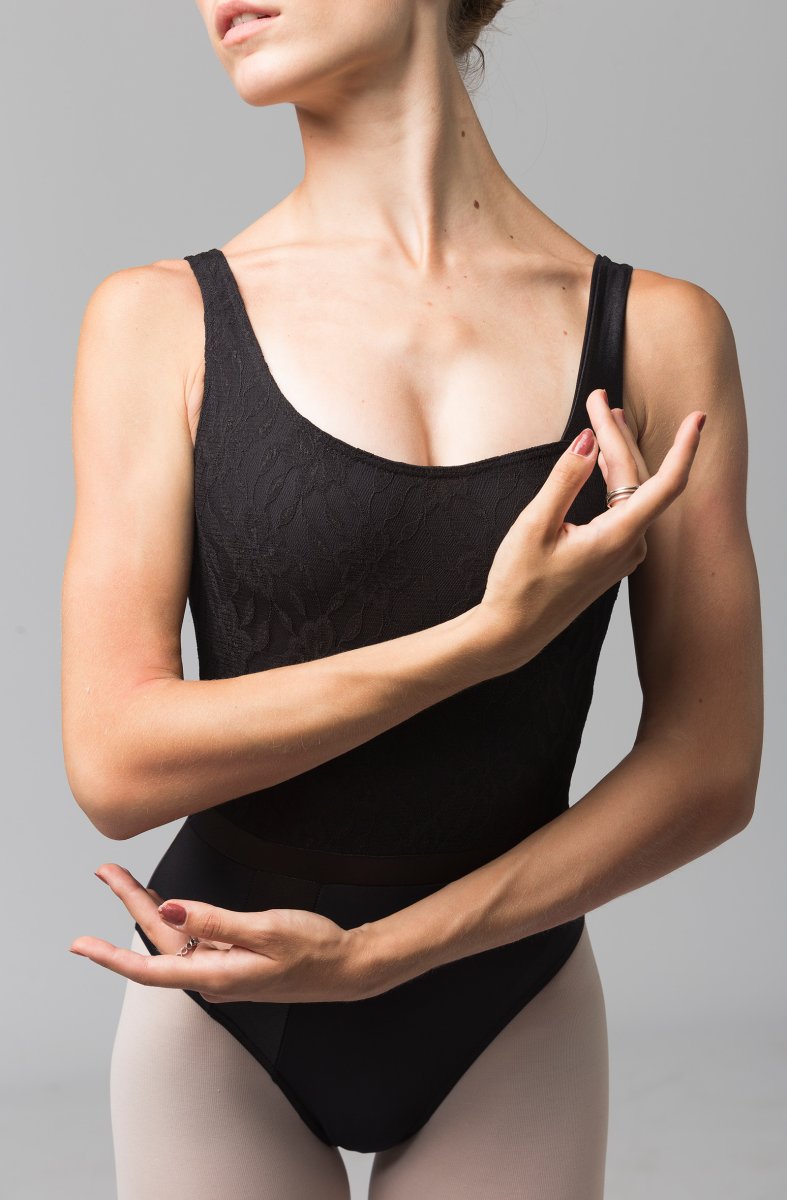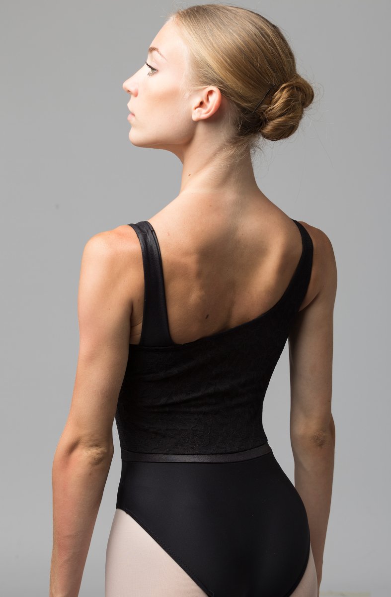 Il merletto elastico, con cui è realizzato il body ed una delle due bretelline, è foderato con Lycra nera. In vita è inserito un cinturino di Lycra lucida impiegata anche per l’altra bretellina di questo modello.