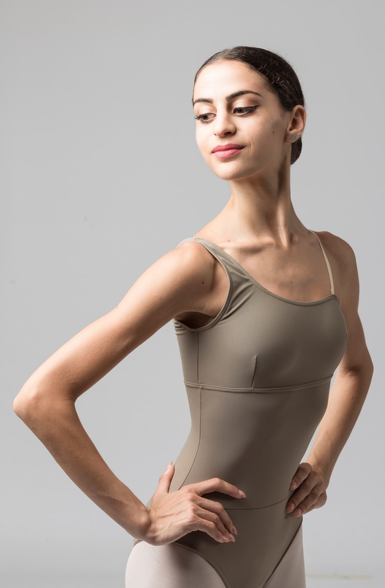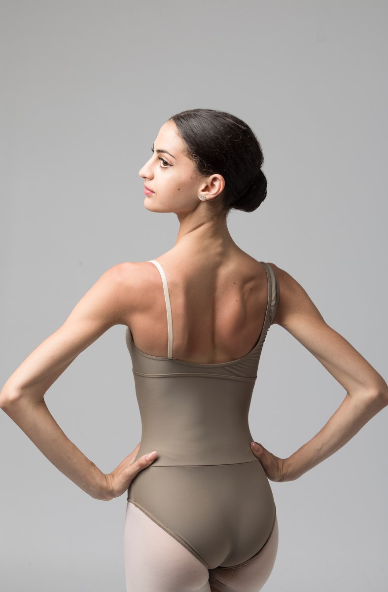 Questo modello è tagliato sotto il seno ed ha due pinces verticali che sagomano il top. Una bretella sottile color carne assicura comunque la massima tenuta al body.