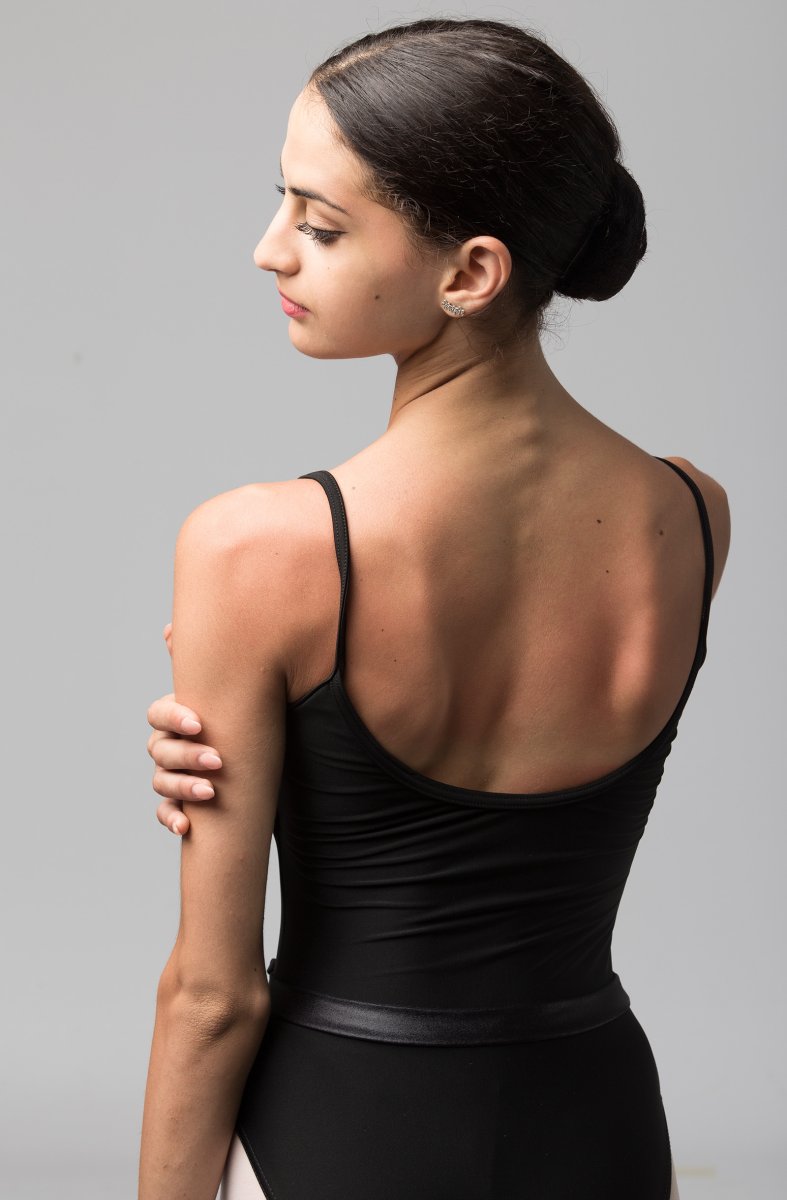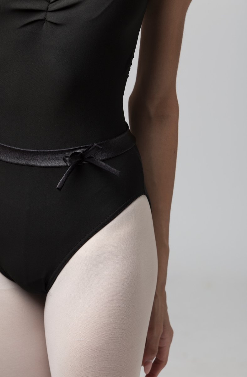 L’arriccio al seno può essere regolato tramite un nastrino di raso. La cinturina in Lycra lucida, con fiocchetto in vita, è in contrasto con la Lycra opaca del body.