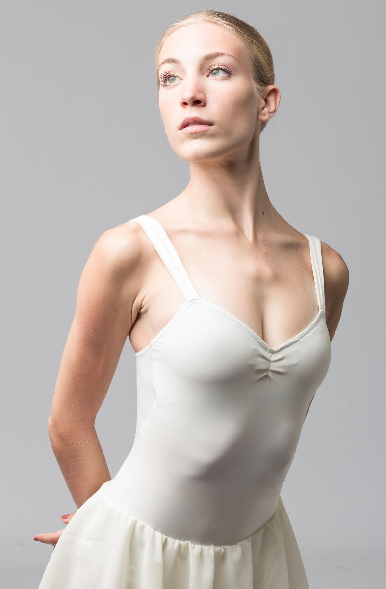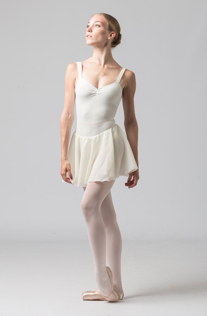L’arriccio al seno assicura una perfetta vestibilità del body. Le bretelle sono realizzate con un bordo schiacciato di Lycra. Il gonnellino è in rete elastica che asseconda ogni movimento.