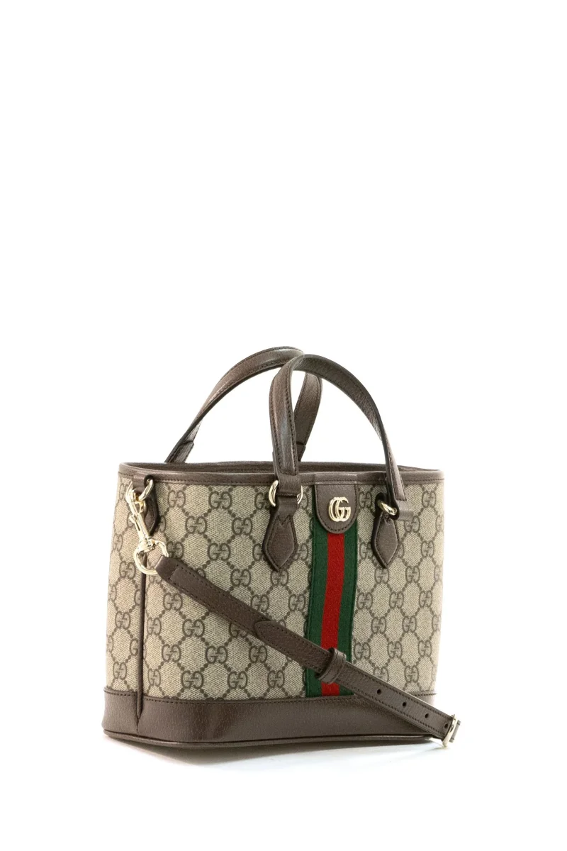 Borsa Ophidia in tessuto GG beige e marrone scuro Composizione: tessuto/ pelle. Dimensioni prodotto: 22,5 x 17 x 11 cm. MADE IN ITALY.
