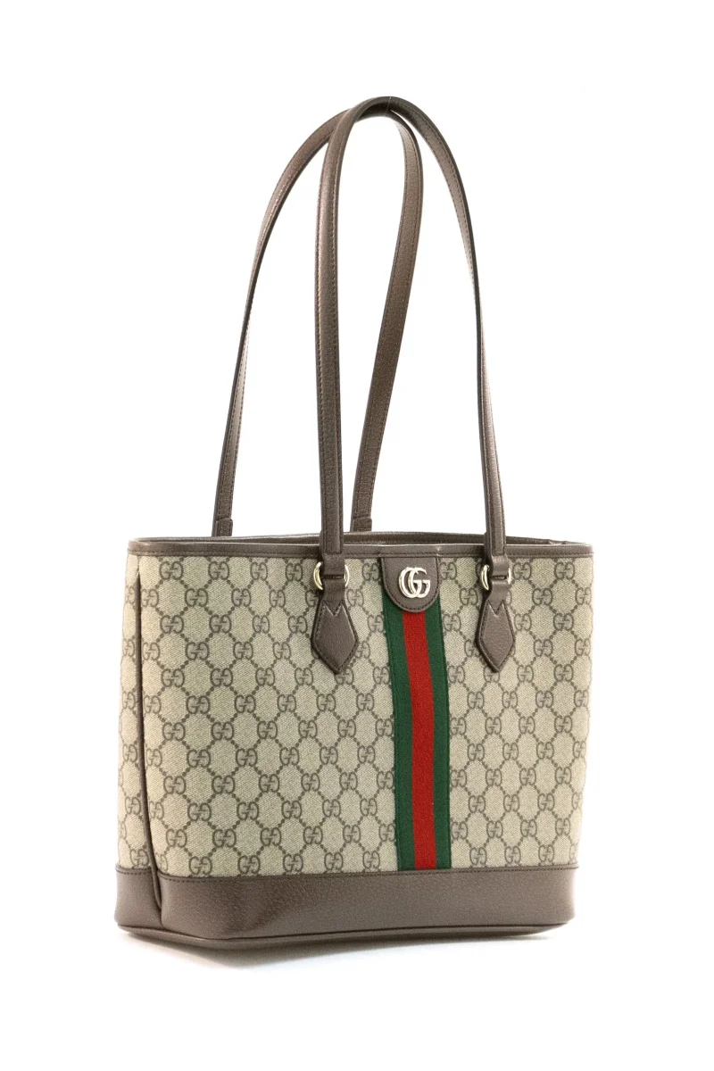 Borsa Ophidia in tessuto GG beige e marrone scuro Composizione: tessuto/ pelle. Dimensioni prodotto: 31 x 24 x 13 cm. MADE IN ITALY.