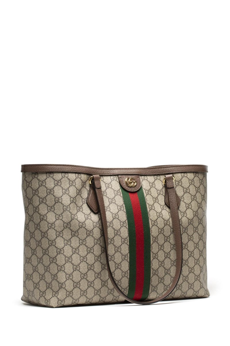 Borsa Shopping Ophidia GG Media in 60% poliuretano, 20% poliestere, 20% cotone con finiture in 100% pelle di vitello. Prodotta in Italia. Misure: larghezza 38 cm x altezza 28 cm x profondità 14 cm. Altezza manici 25 cm