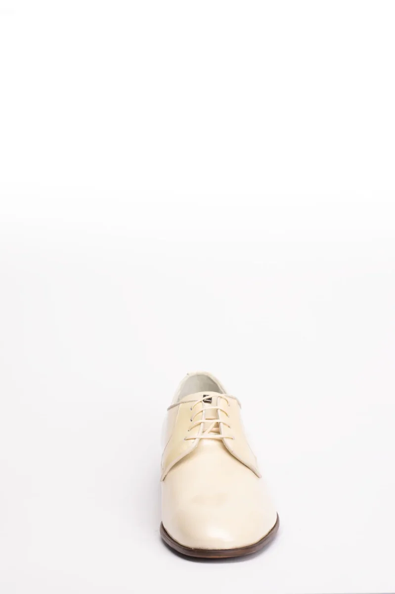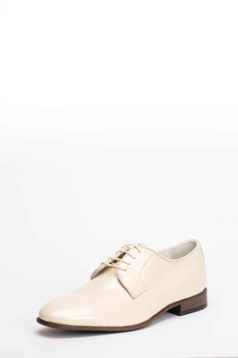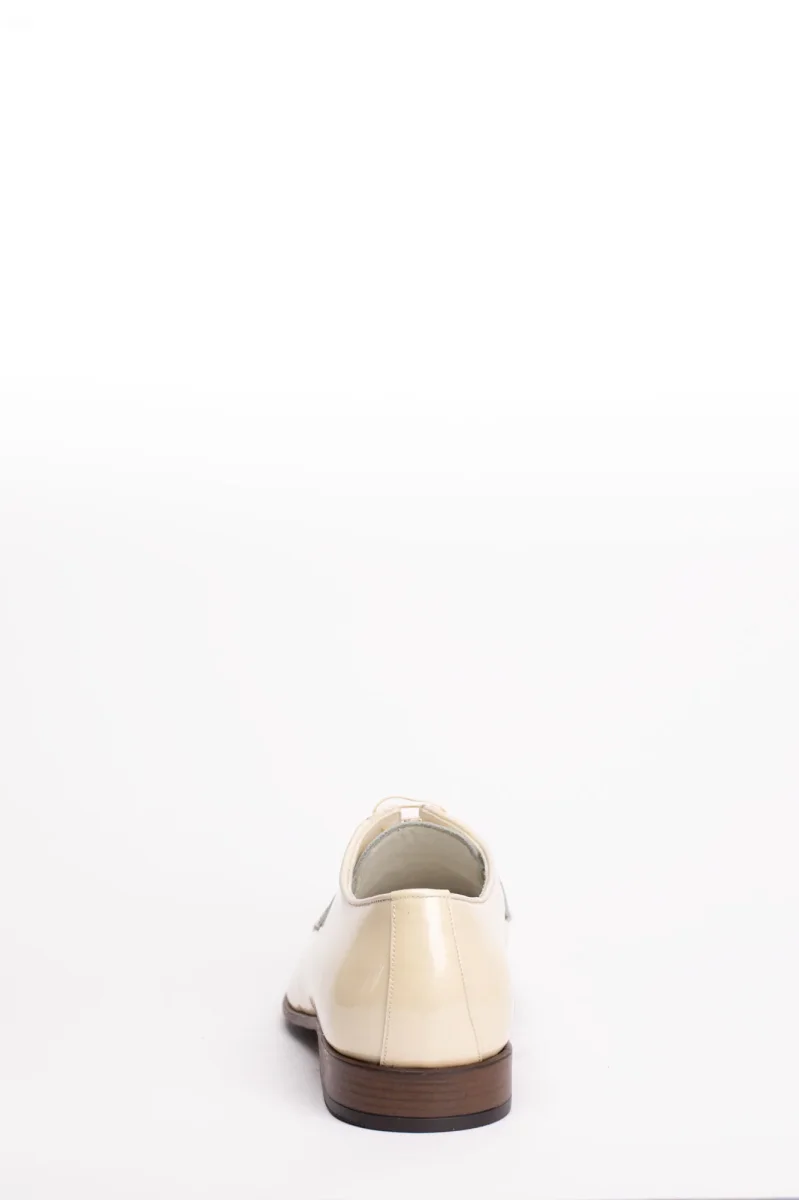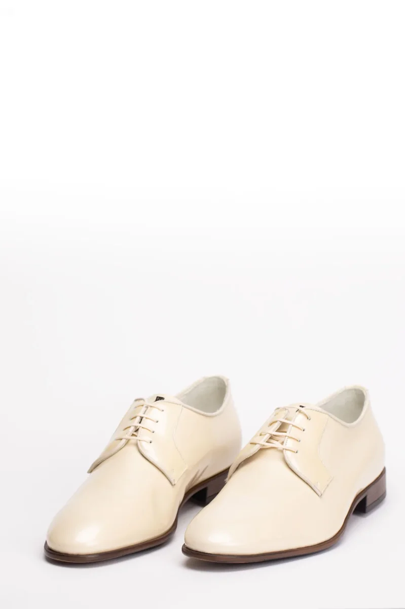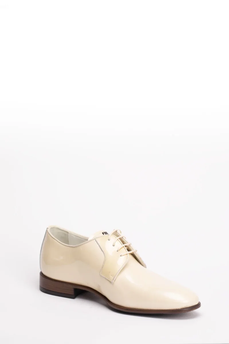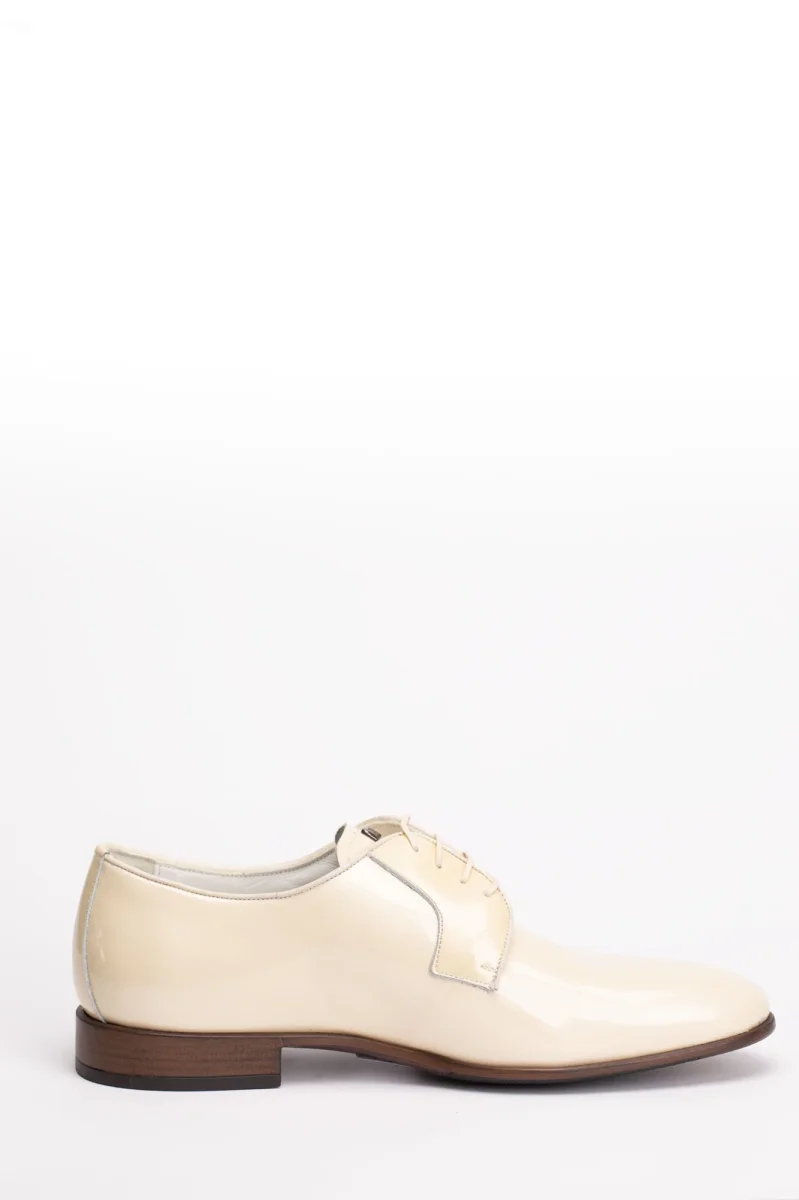 Scarpa da cerimonia raffinata, ideale per matrimoni ed eventi formali. Realizzata in pelle lucida di alta qualità. Tonalità avorio che si abbina perfettamente a completi chiari e smoking eleganti.
