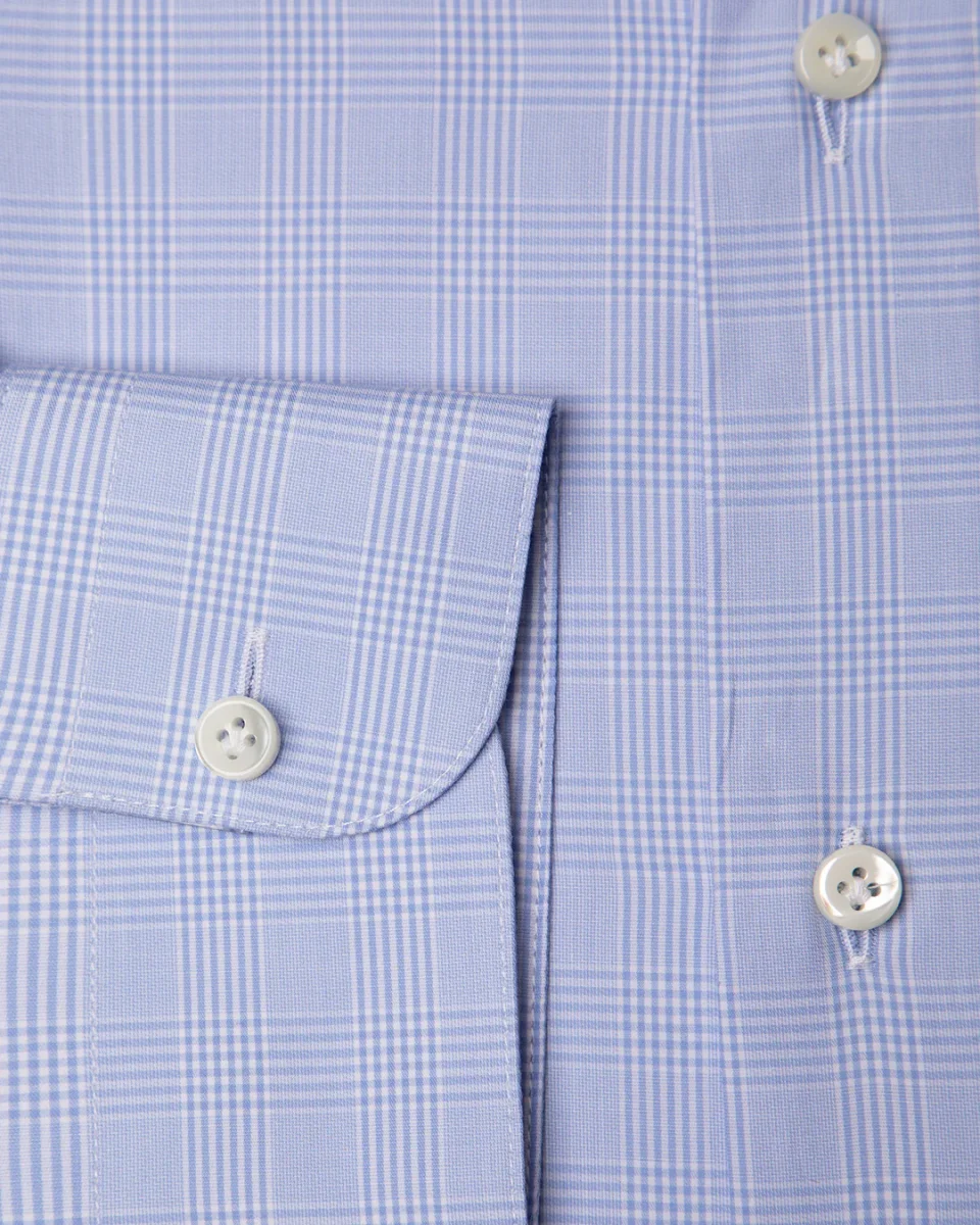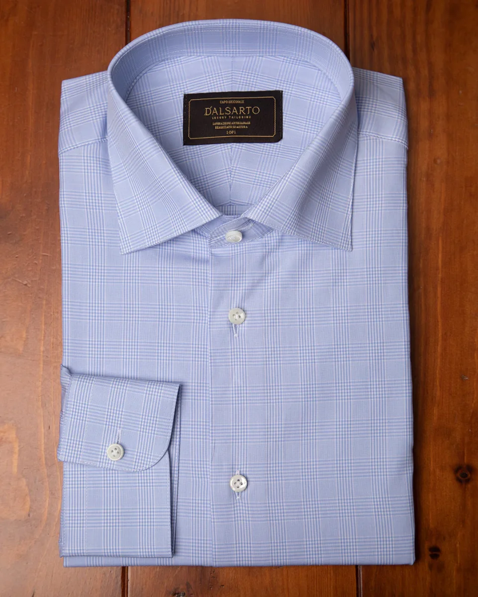 Camicia azzurra a quadri in puro cotone, con collo francese, polso stondato a un bottone e bottoni in madreperla naturale. Il disegno classico del tessuto, rivisitato in tonalità chiare, dona al capo una presenza sofisticata ma mai eccessiva, perfetta anche per un uso quotidiano curato.
