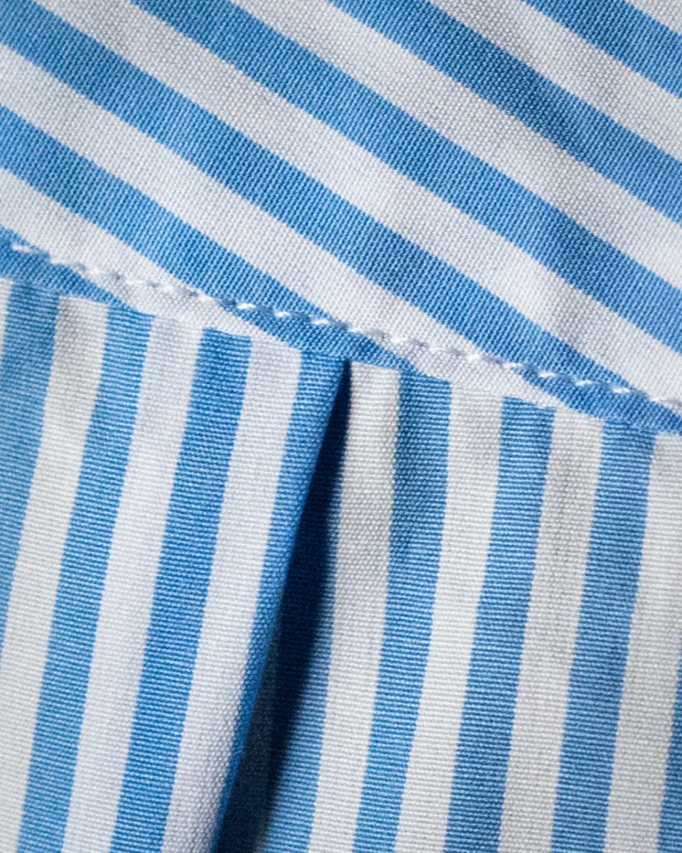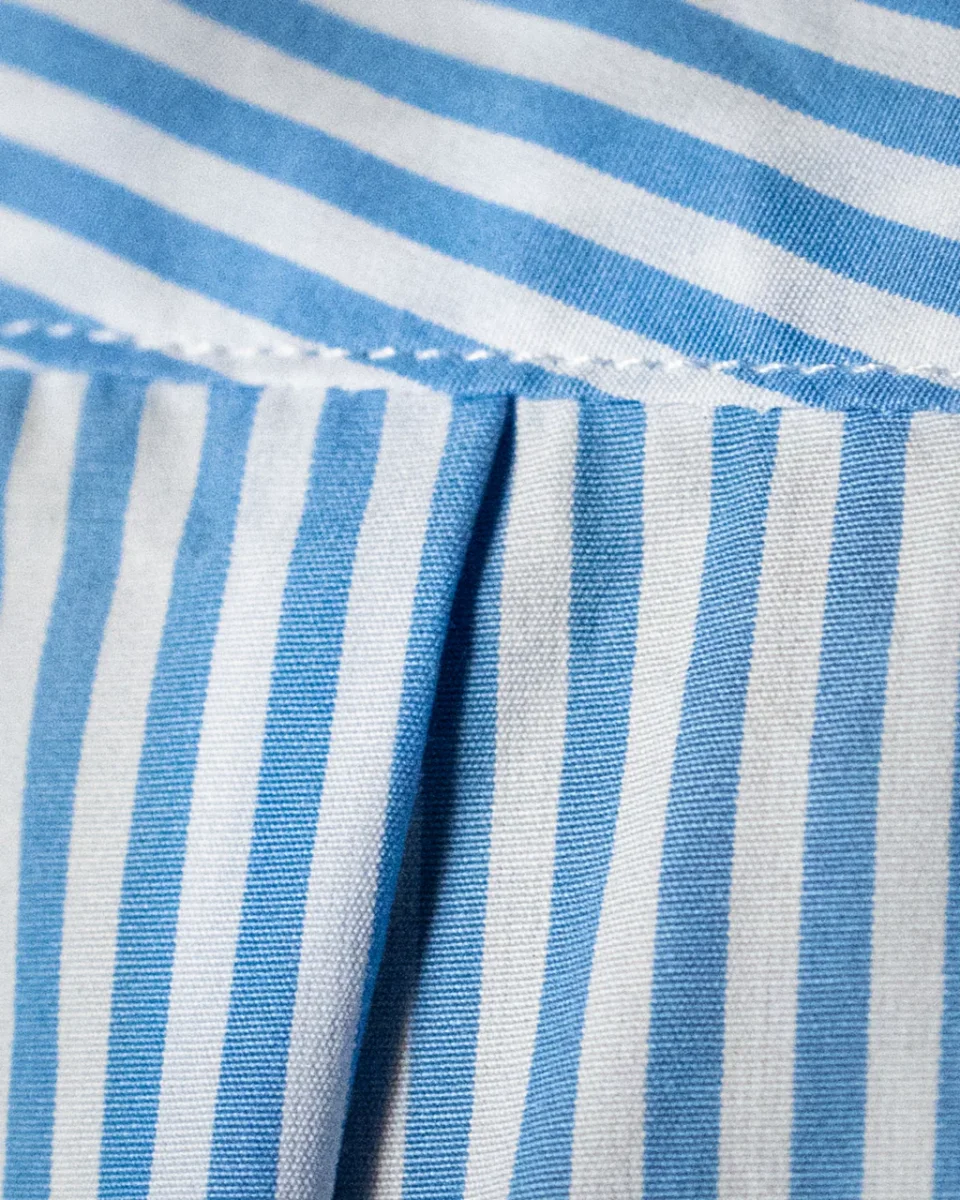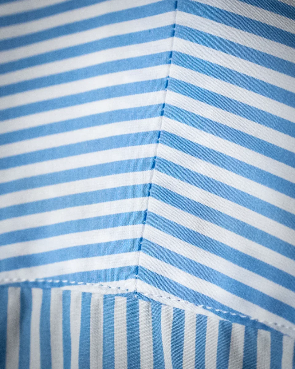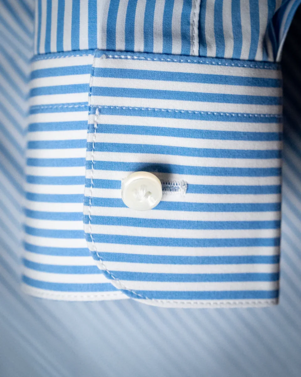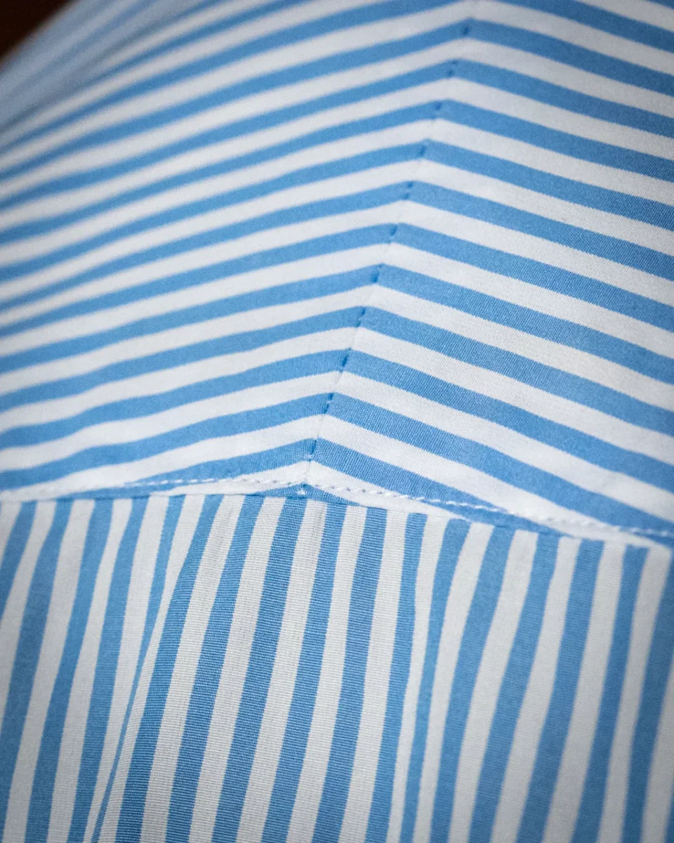 Il motivo bacchettato azzurro e bianco dona un effetto visivo raffinato e dinamico, ideale per chi cerca una camicia classica ma con personalità. Il colletto francese corto valorizza il design contemporaneo, mentre l’abbottonatura scoperta e il polsino classico completano il capo con un tocco di ordine e precisione sartoriale.