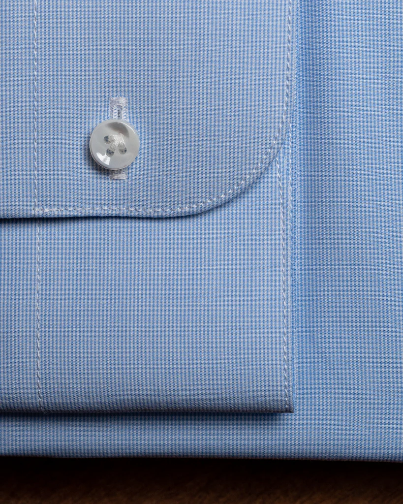 Il motivo a mini quadri aggiunge un tocco distintivo e dinamico al classico azzurro, mentre il collo francese dona un’eleganza sobria e versatile, perfetta sia per contesti professionali che per occasioni casual. L’abbottonatura scoperta completa il design con una linea pulita e moderna.