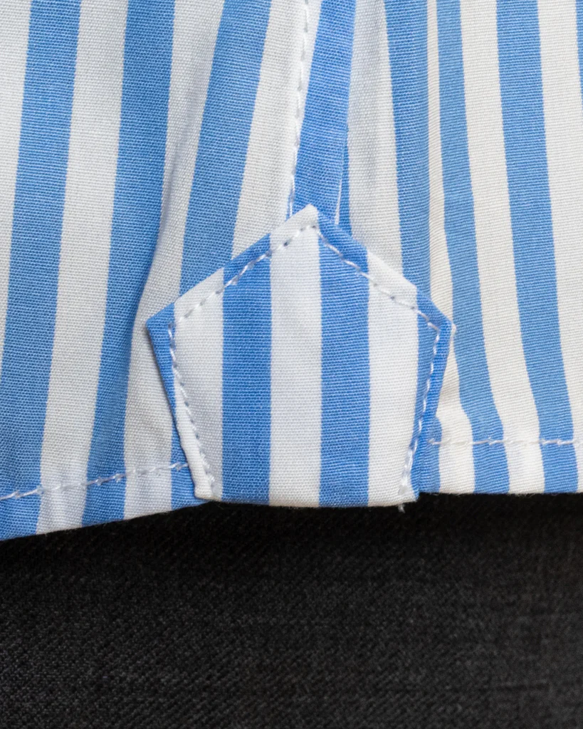 - Tessuto: realizzata in cotone stretch bacchettato azzurro, per una vestibilità impeccabile e un tocco sofisticato.