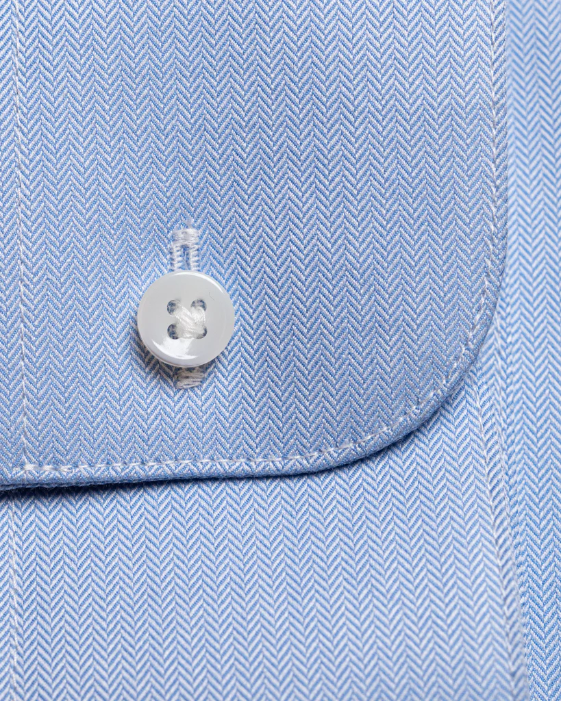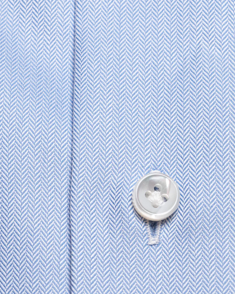 - Bottoni Bianchi: I bottoni bianchi creano un elegante contrasto con il tessuto azzurro chiaro, aggiungendo un dettaglio raffinato.