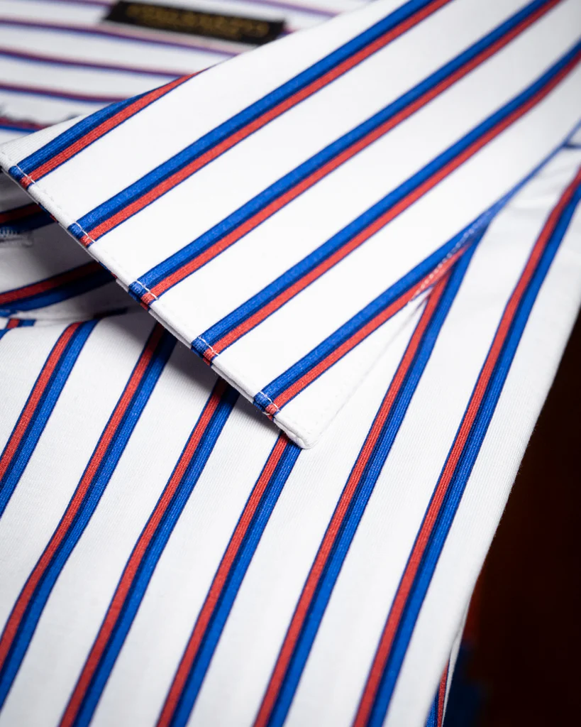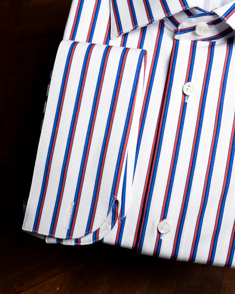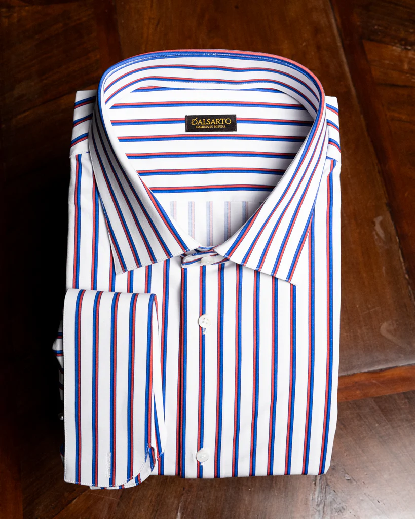 - Tessuto a righe azzurre e rosse su base bianca: Il motivo a righe su fondo bianco aggiunge vivacità al look, mantenendo un’estetica sofisticata e raffinata.
