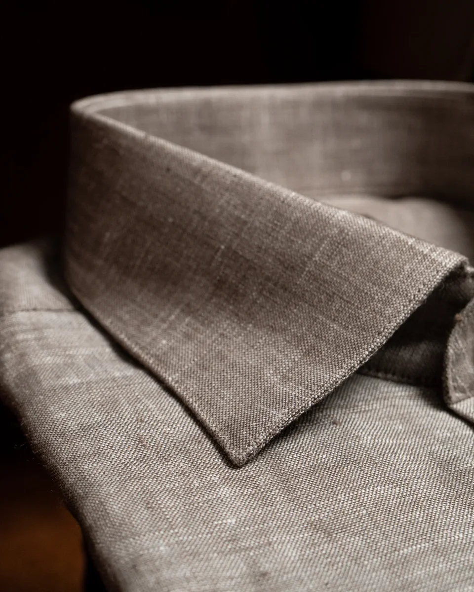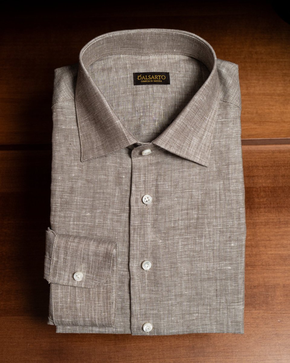 Realizzata con un tessuto marrone in lino di alta qualità, questa camicia garantisce comfort e freschezza, ideale per un look casual ma elegante.