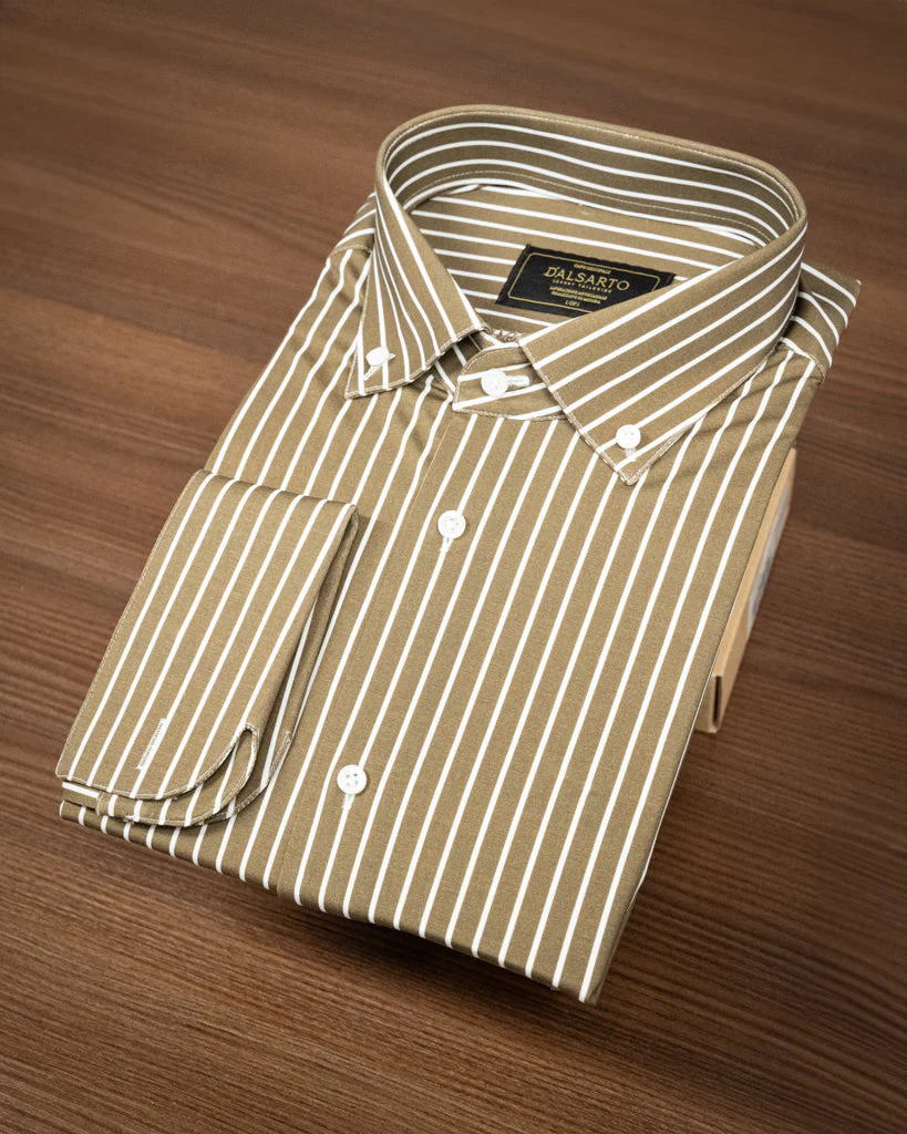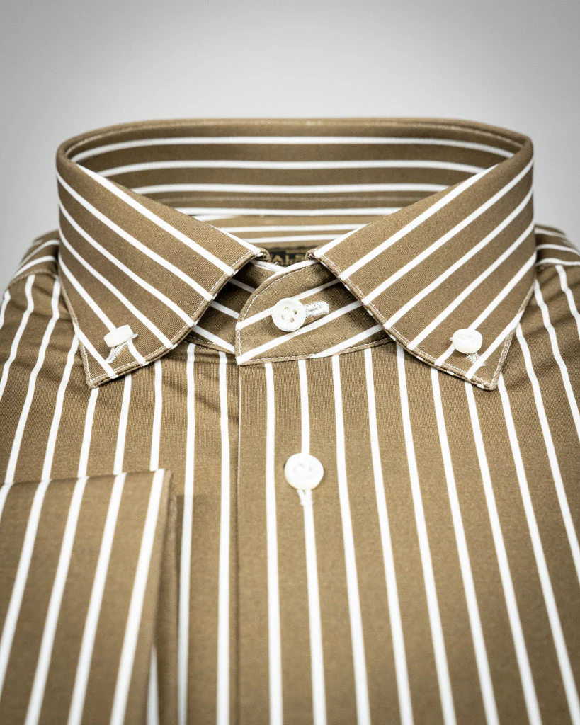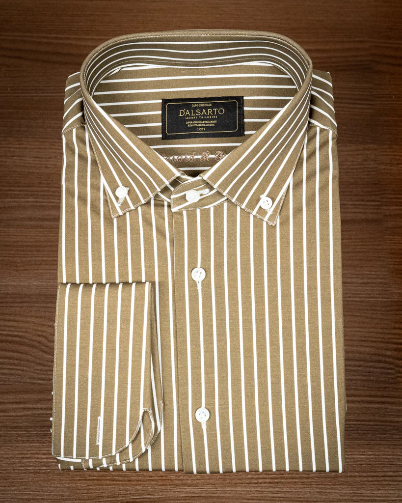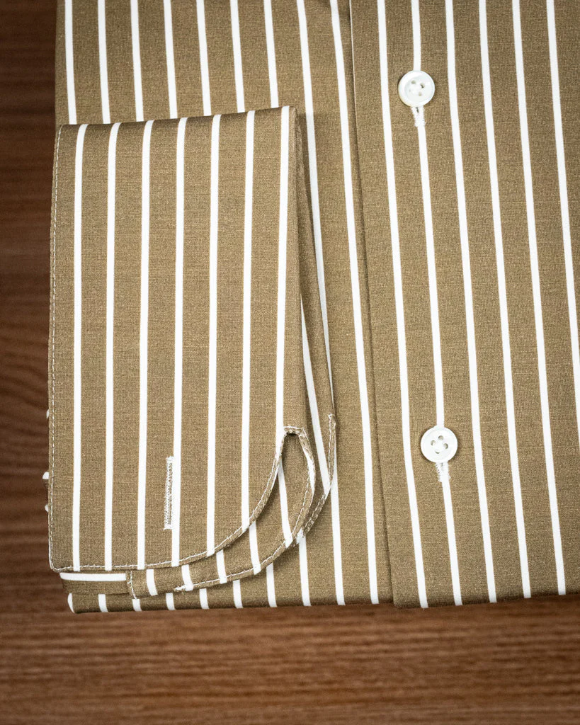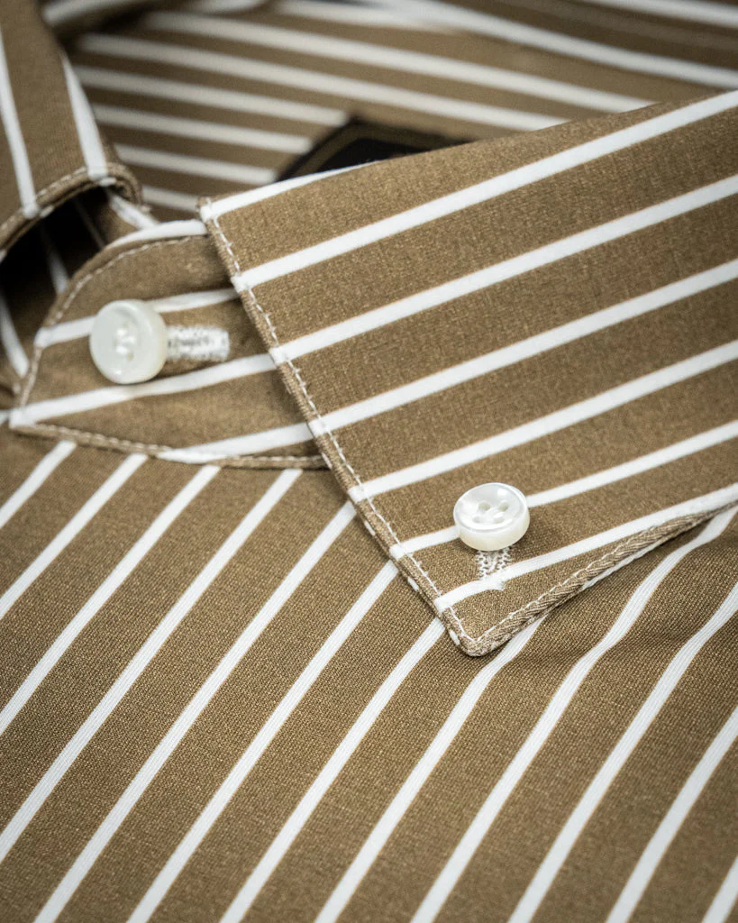 La Camicia Marrone Bacchettata è perfetta per chi cerca un capo business che unisca comfort, eleganza e versatilità, grazie al suo tessuto stretch e al motivo a righe marroni e bianche.