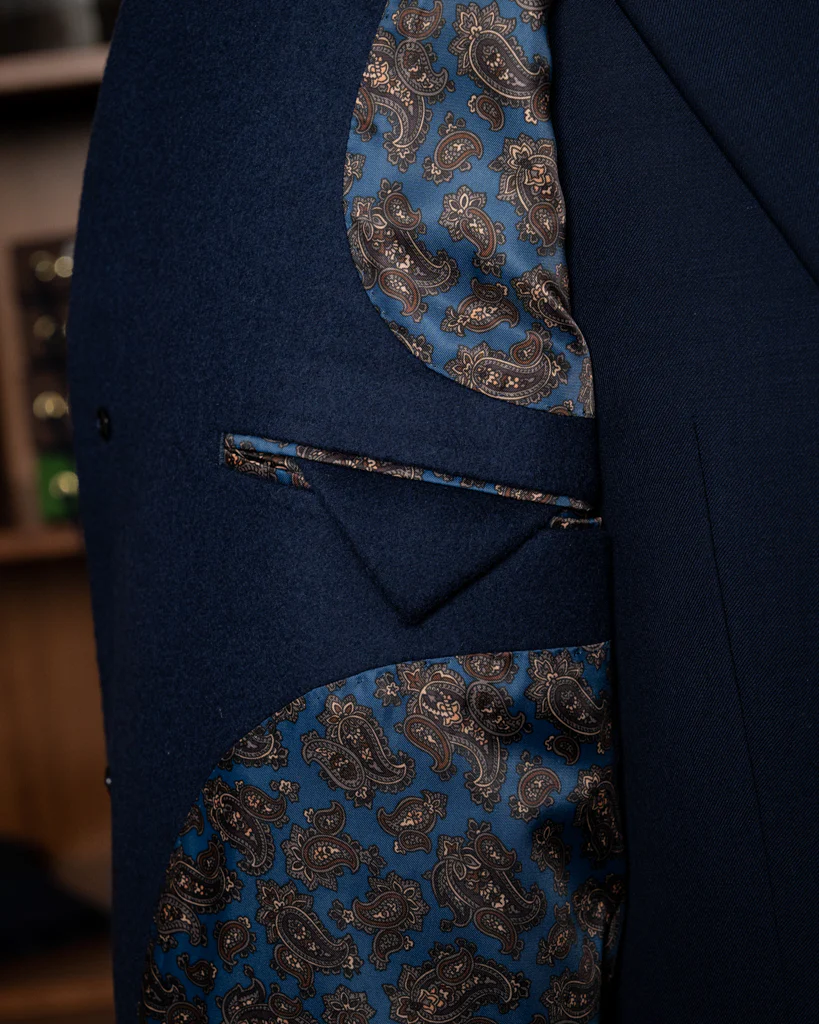 - Finiture: Taschino a barchetta sul petto per l’inserimento della pochette e bottoni in corno scuro coordinati. L’interno è rifinito con fodera in viscosa traspirante tono su tono.