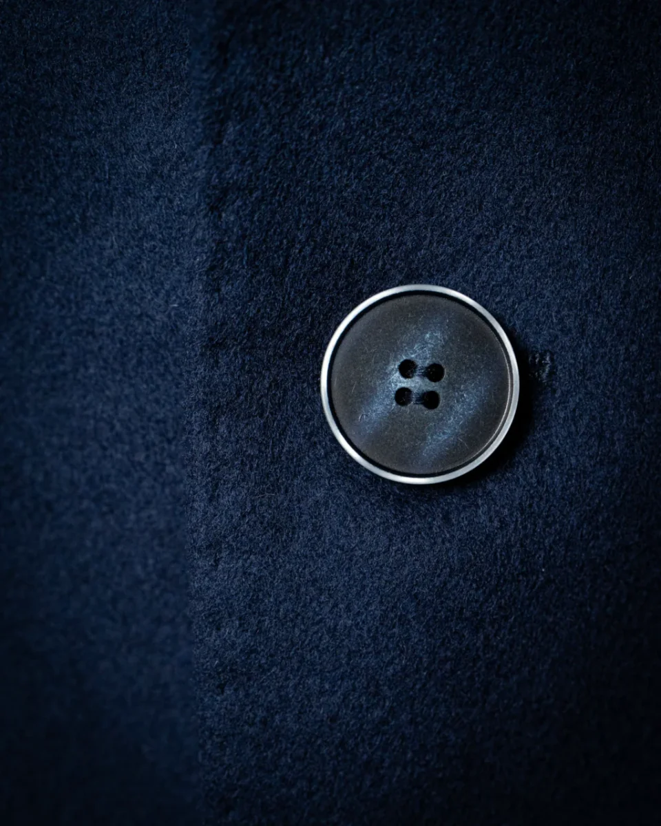 - Finiture: Impunture sartoriali sui bordi che sottolineano l’artigianalità del pezzo. Bottoni in tinta coordinata per un look “total navy” di grande coerenza.
