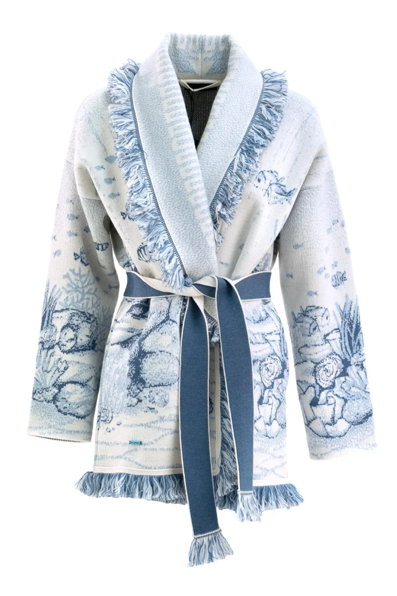 Cardigan Deep In The Ocean in lana di color gesso e azzurro Composizione: 92% lana 8% poliammide.