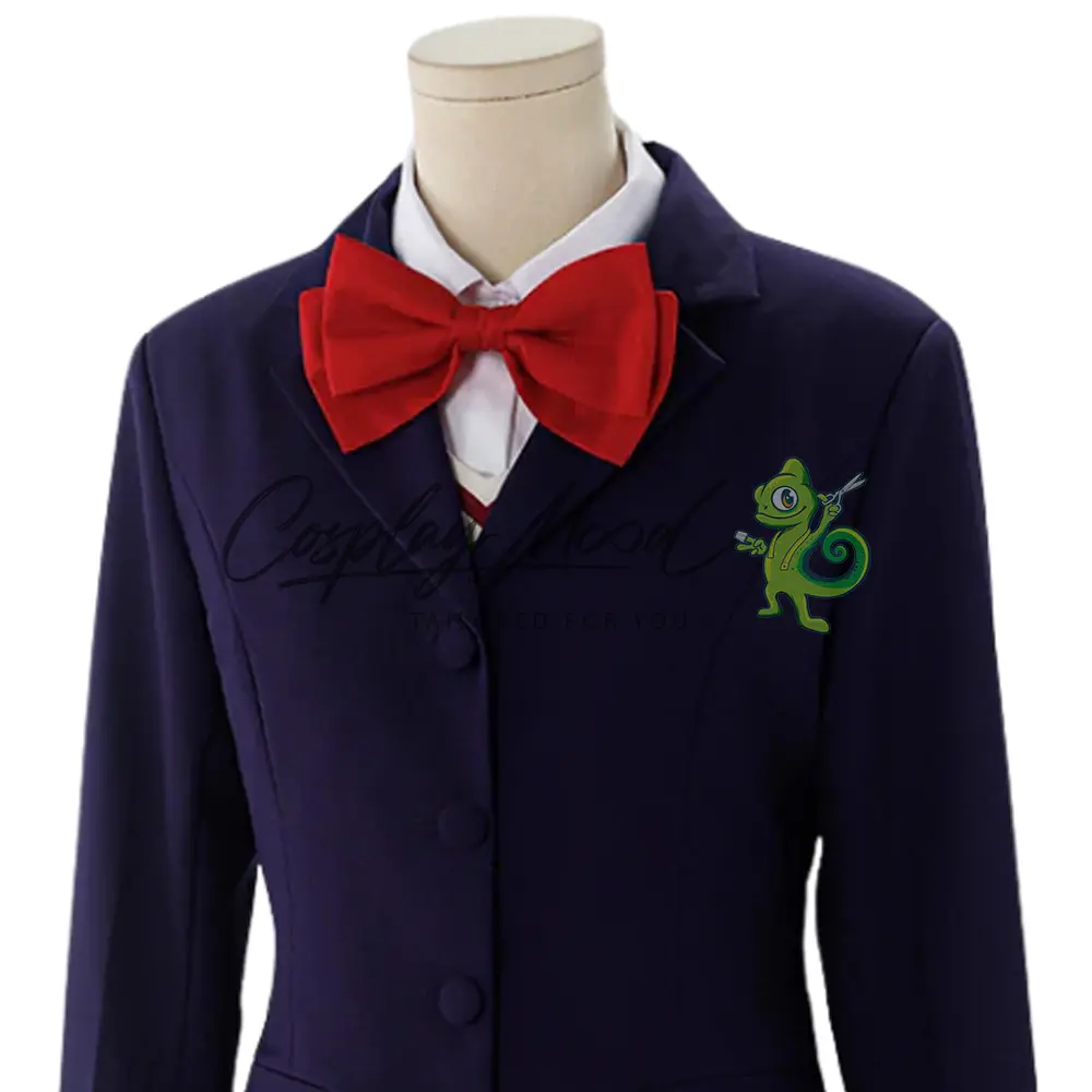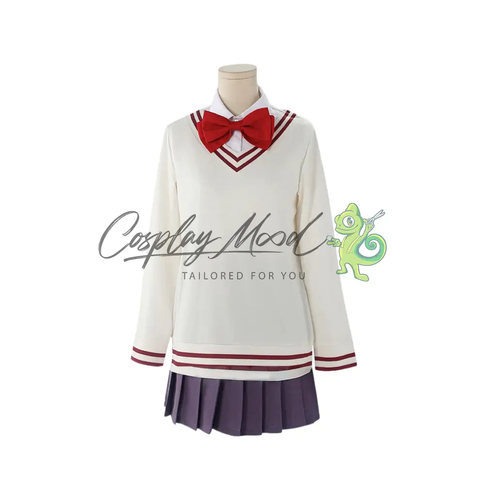 Divisa scolastica con papillon rosso e gonna grigia, calze bianche abbinate e giacca blu scura.