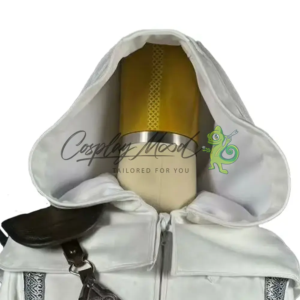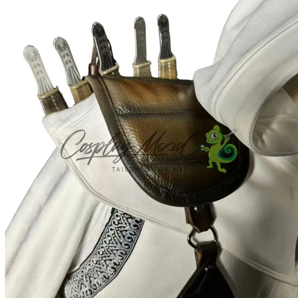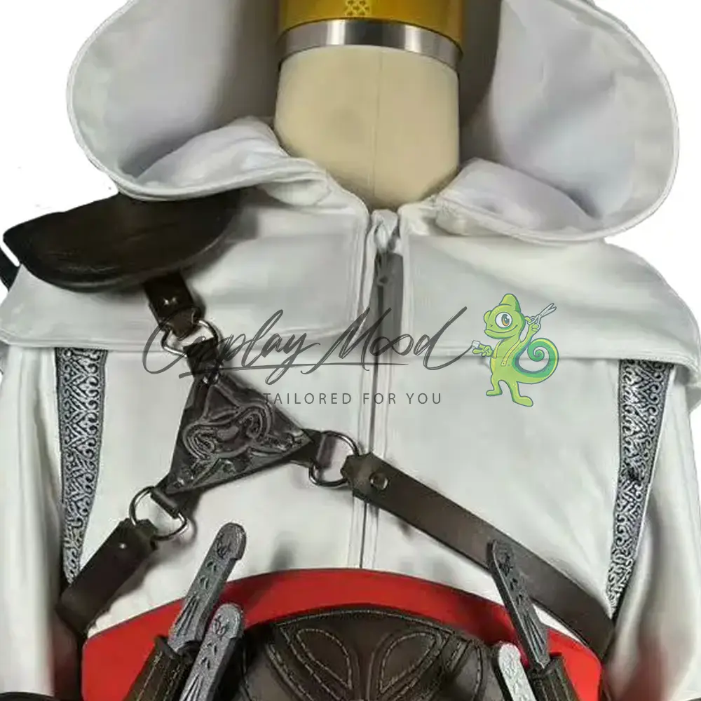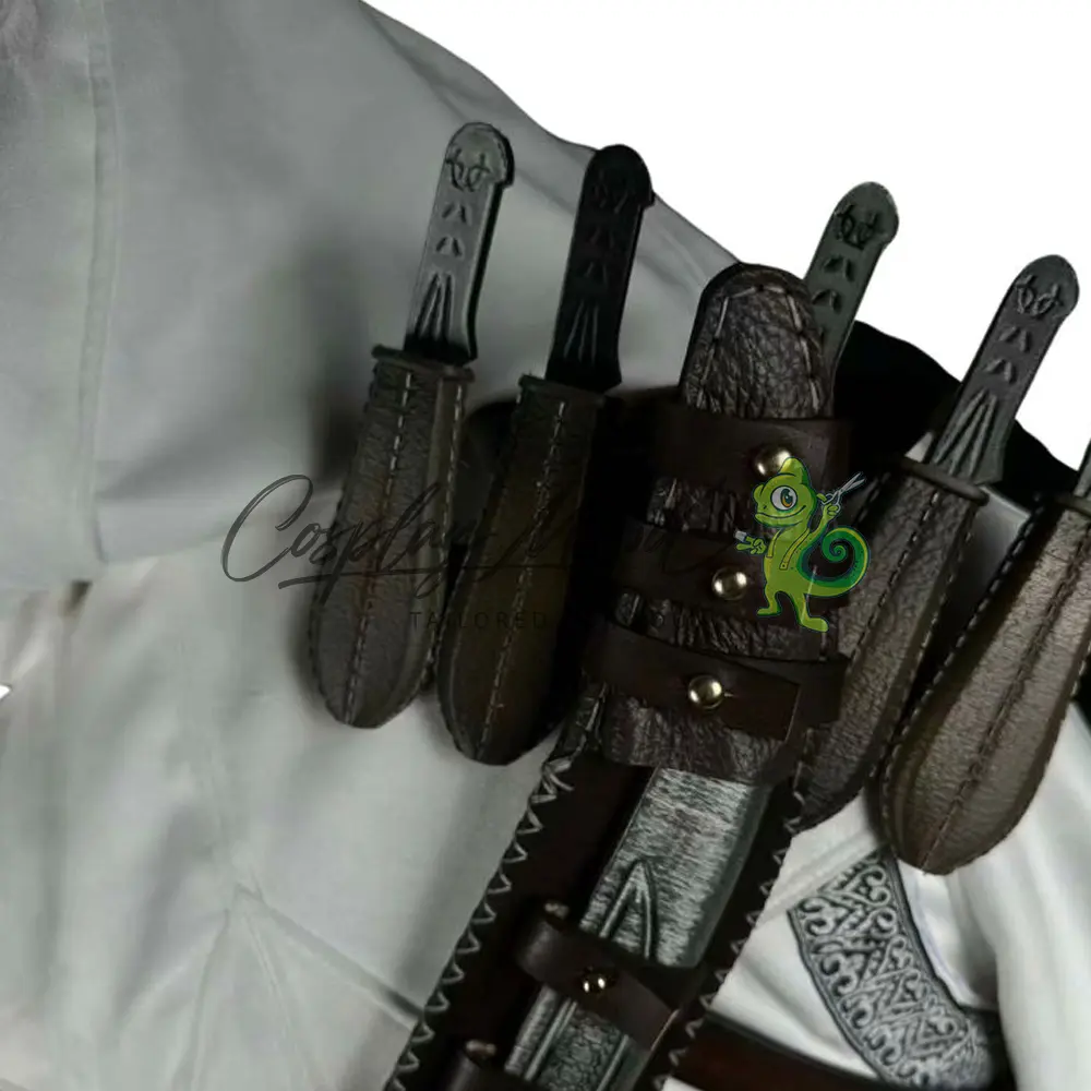 Veste bianca con cappuccio e mantella aperta sul fronte, decorata di grigio alle ascelle, fascia rossa in vita, cinturone marrone con cintura pendente dotata di fibbia argentata, bracciali marroni in eco pelle con cinghie e placchette decorative, cinghia per il petto con aggancio alla spallina, porta pugnali marrone da mettere sulla schiena, porta spada, pugnali e spada sono inclusi nel prezzo, completa la decorazione per la cintura corredata anche in questo caso da pugnali. Realizzato in eco pelle e misto cotone.
