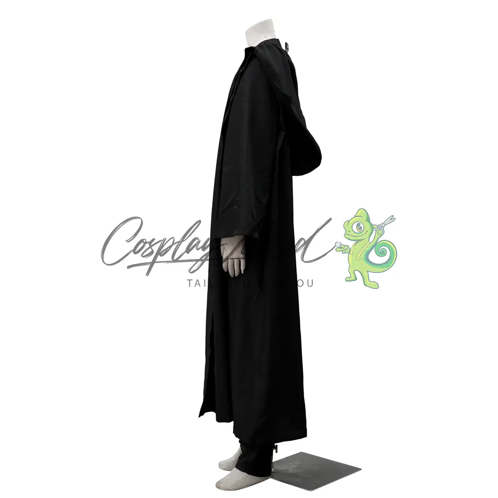 Cappotto lungo nero, veste sempre color nero, sopra veste nera lucida, bracciale destro rinforzato, guanto nero, cintura nera con fibbia e borsellino laterale, pantaloni neri.