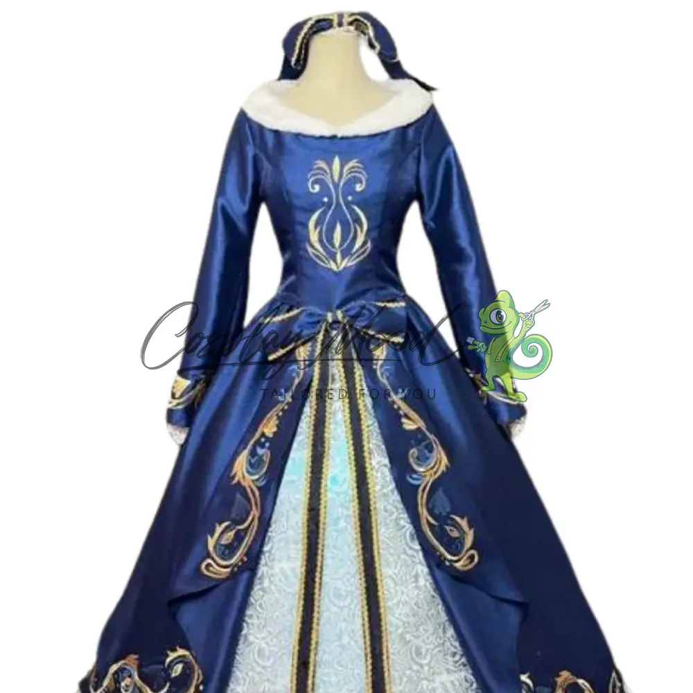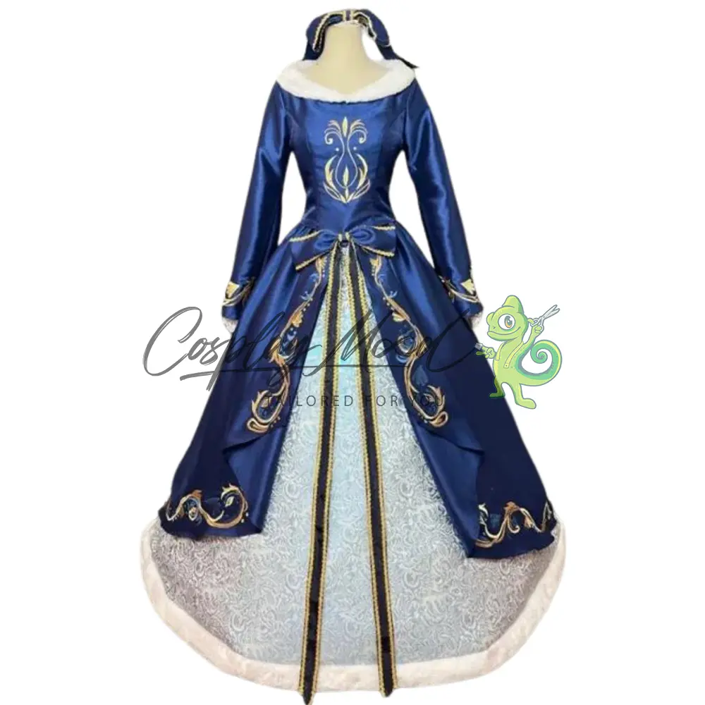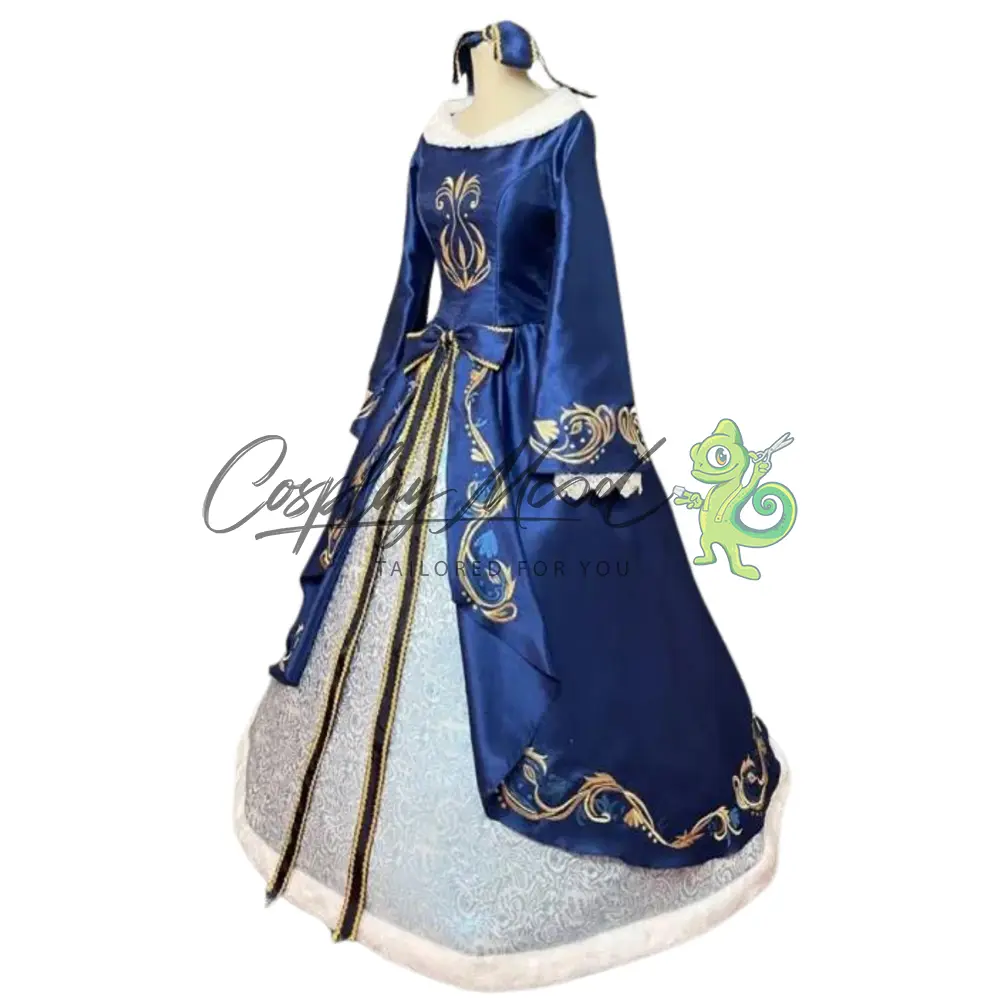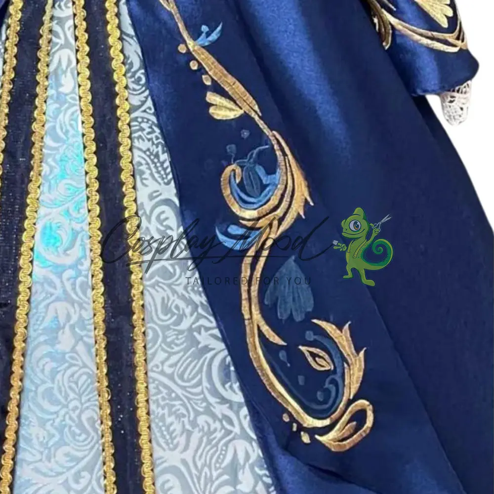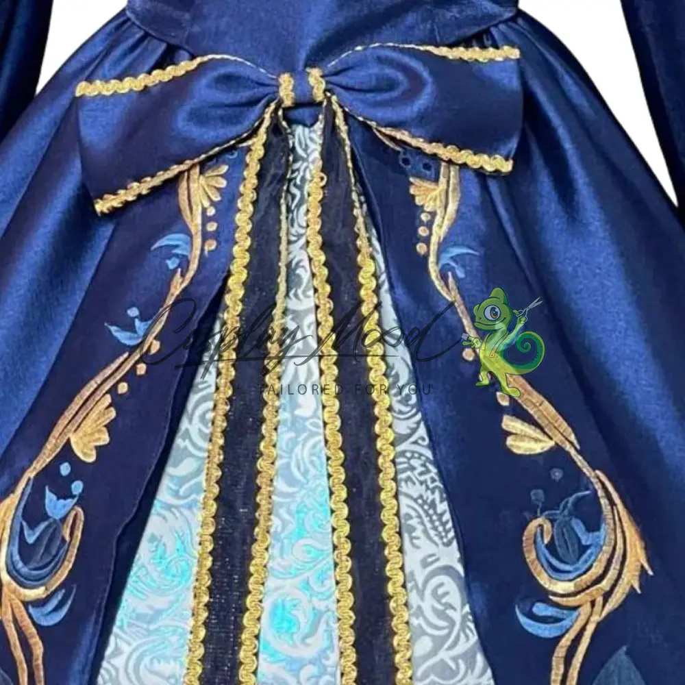 Ampio e lungo vestito blu con decorazioni e ricami dorati, colletto bianco, nastro frontale nero e dorato, fiocco decorato per i capelli.