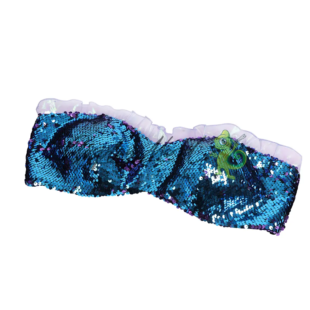 Reggiseno con paillettes e tessuto arricciato trasparente nella parte alta, coda con medesima texture, pizzo e strascico multiplo per simulare la coda da sirena.