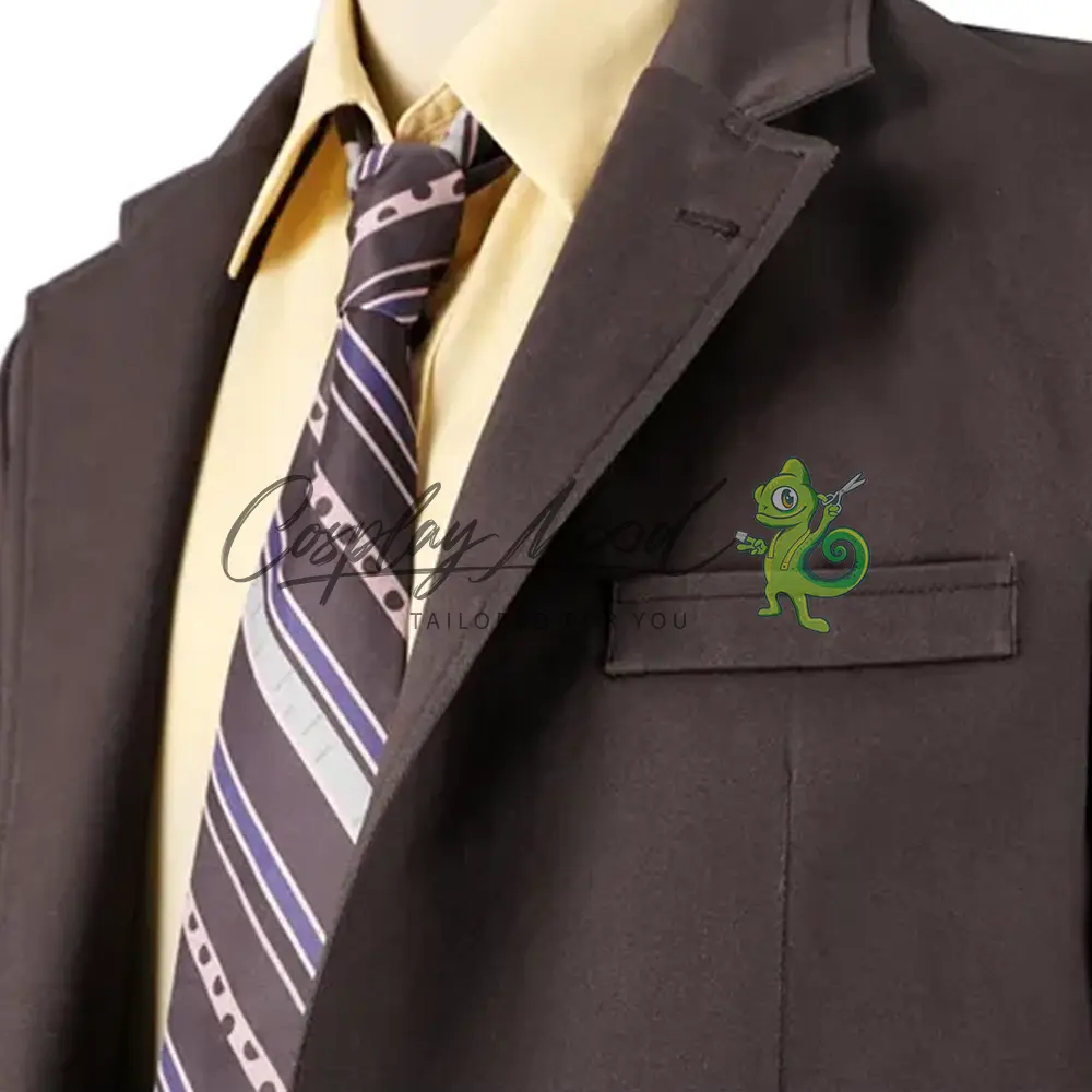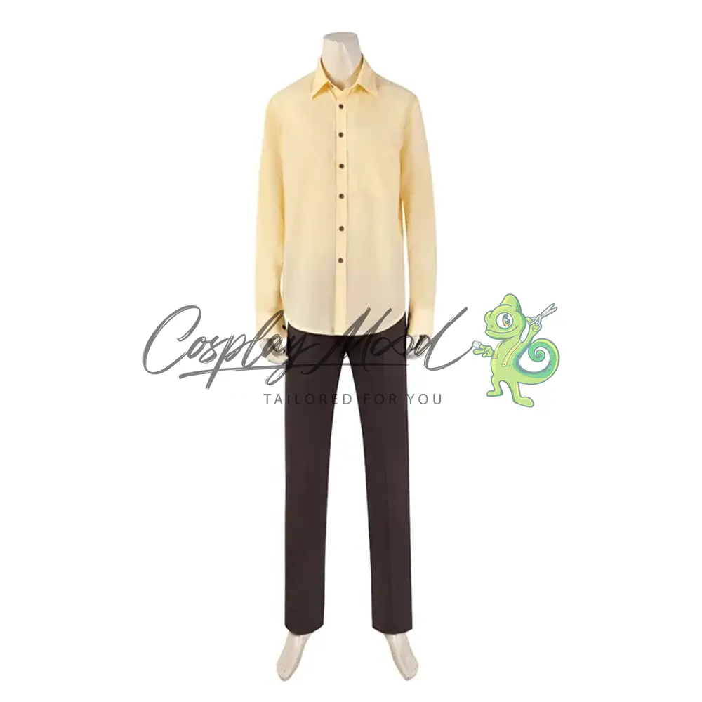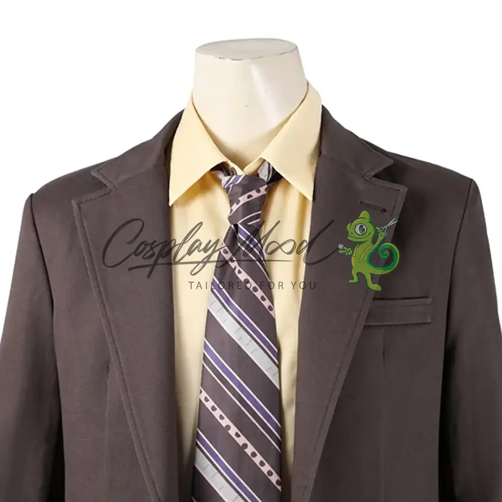 Pantaloni lunghi e giacca color grigio caldo, camicia giallo chiaro con bottoni scuri, cravatta con texture a righe. Scarpe in coordinato vendute separatamente ed ordinabili su richiesta.