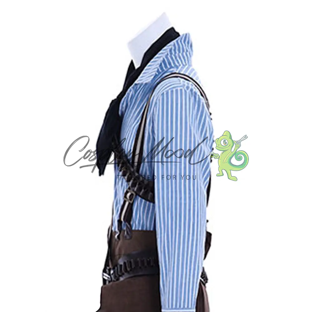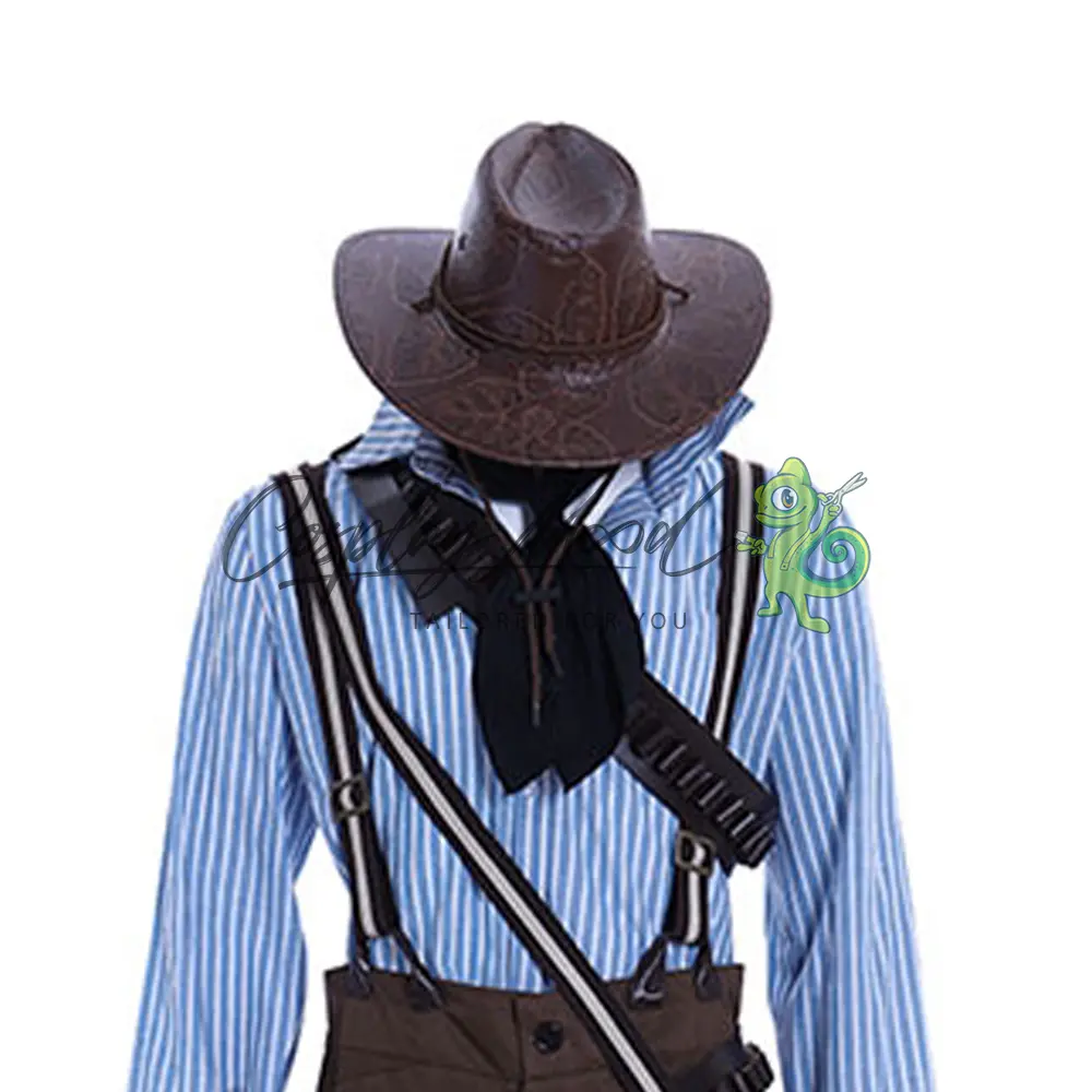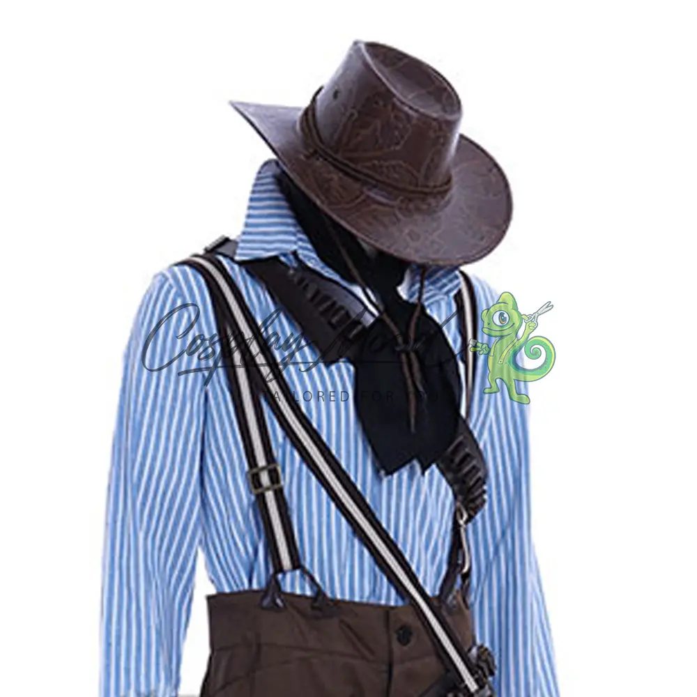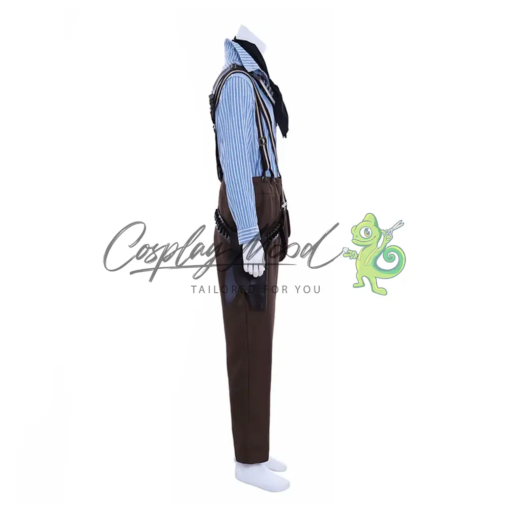 Camicia azzurra a righe bianche, foulard nero, cappello marrone scuro da cowboy con laccetto, pantaloni lunghi marronni, cintura con fibbia dorata e fondina, bretelle a righe, cintura per il petto e borsa.