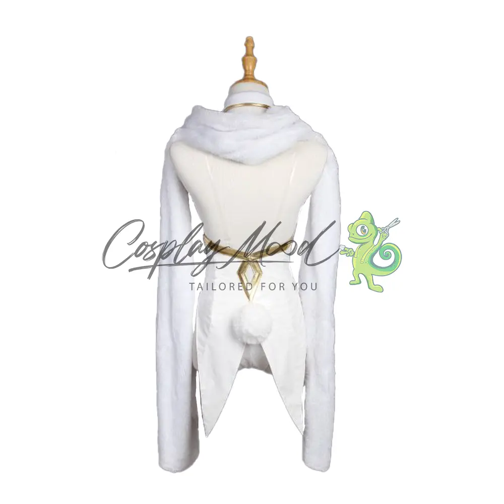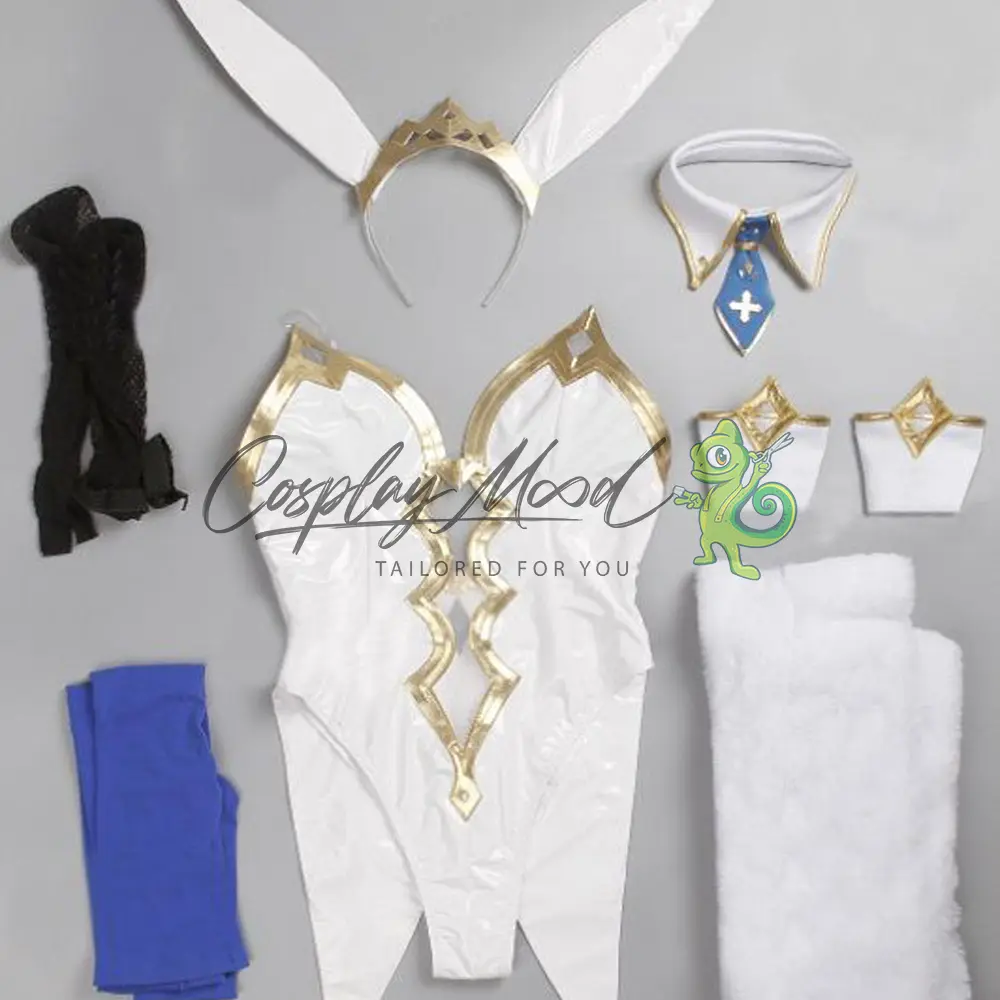 Sciarpa lunga bianca morbida, top lavorato con decorazioni dorate e coda da coniglietto sul retro, cravattino azzurro con colletto bianco e dorato per il collo, passata con coroncina dorata ed orecchie da coniglio, polsini bianco e bordati di dorato, calze blu e calze a rete da posizionare sopra ai pantaloni.
