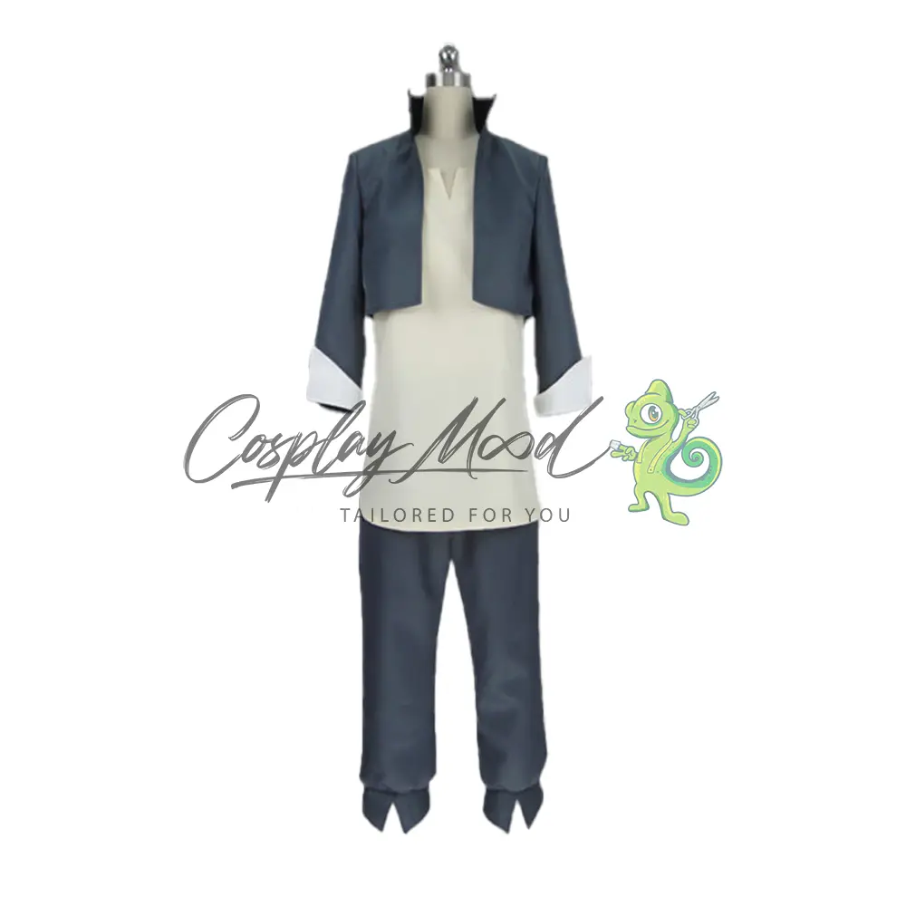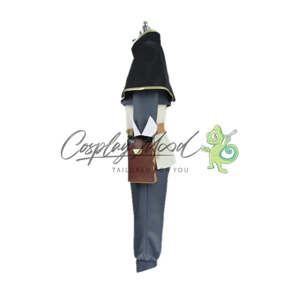 Mantellina nera con bordi dorati e stemma dell’ordine, giacca grigia con maniche bianche, t-shirt bianca e pantaloncini grigi con risvolto, completa la fascia nera con decorazione dorata per i capelli e la cintura con porta grimorio laterale.