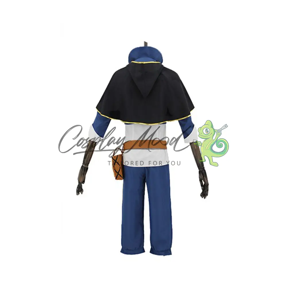 Mantellina nera con bordi dorati e stemma dell’ordine, giacca blu con collo alto e bordo rovinato, maglia bianca con maniche a risvolto, pantaloni lunghi blu, completa la fascia nera con decorazione dorata per i capelli e la cintura con porta grimorio laterale.