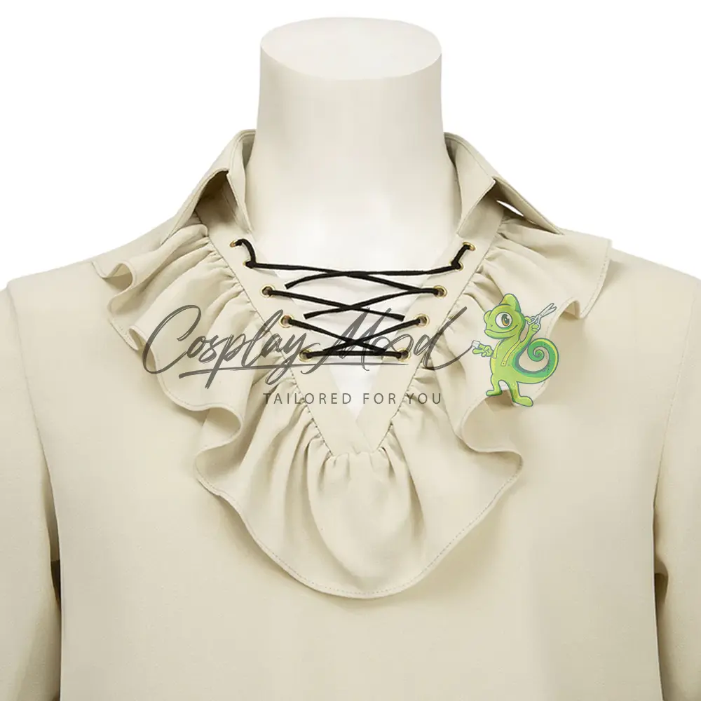 Camicia color panna con colletto a sbuffi e lacci neri, pantaloni lunghi marroni e neri con texture.